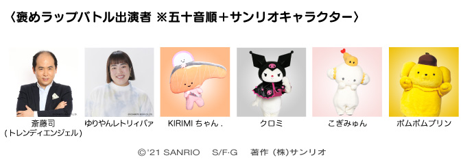 褒めラップバトルでは、斎藤司さん(トレンディエンジェル)、ゆりやんレトリィバァさんをゲストに迎え「KIRIMIちゃん.」「クロミ」「こぎみゅん」「ポムポムプリン」とともに魂の叫びをぶつけ合います!