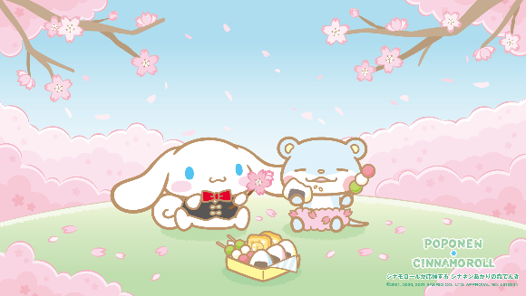 自然の中でお花見を楽しむ「シナモロール」と「ポポネン」の、ほっこりするイラストが楽しめます。