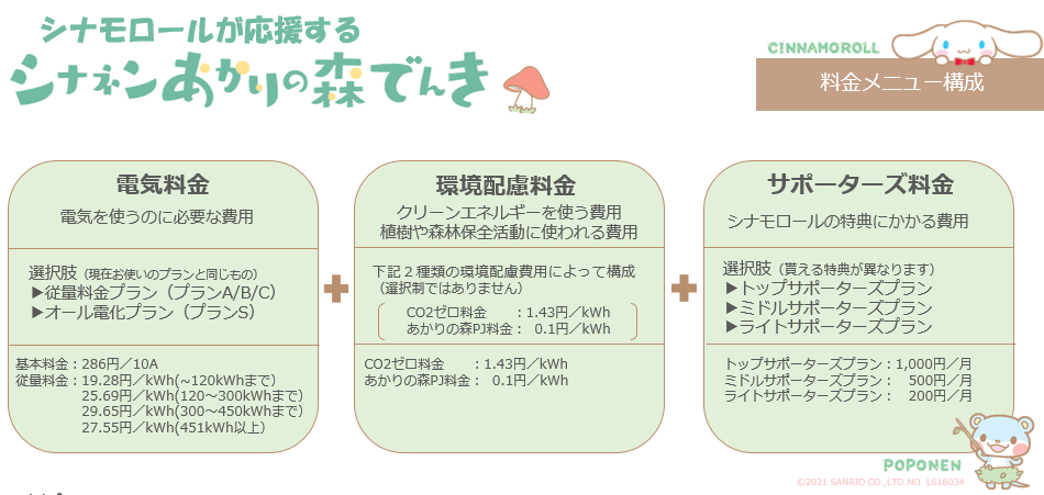 「シナモロール」が応援する「シナネンあかりの森でんき」プランは、電気を使用する際にかかる電気料金と、クリーンエネルギーを使う費用・森林保全活動に使われる費用、そして「シナモロール」の特典がもらえるサポーターズ費用から構成されたプランです。