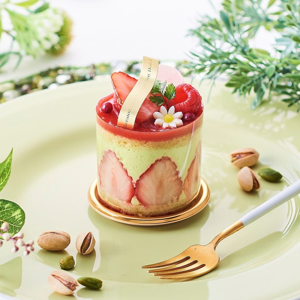 ピスタチオの生地で挟んだ、たっぷりの苺とピスタチオクリームをパイ生地の上に乗せた「ピスタチオのフレジェ」