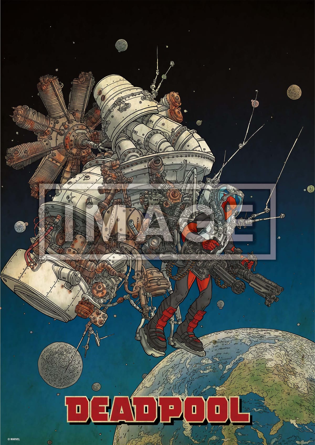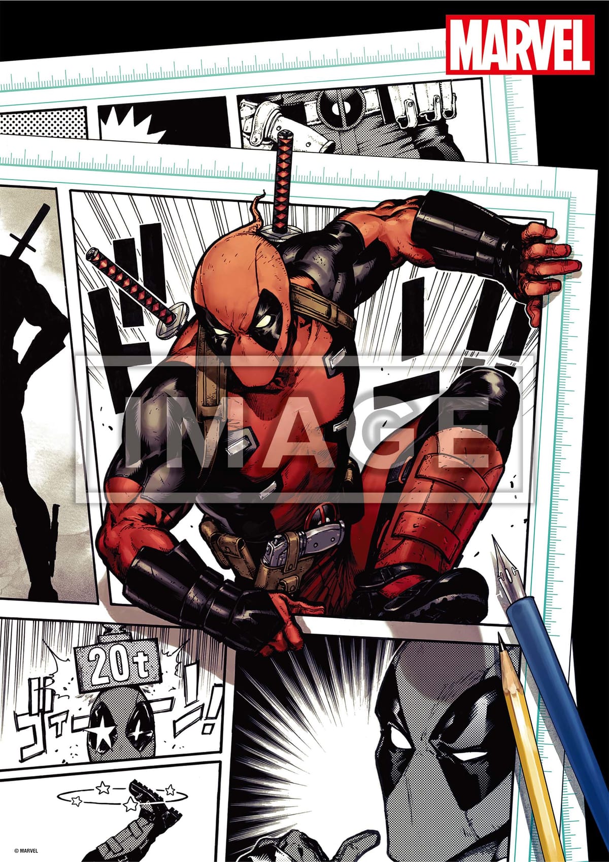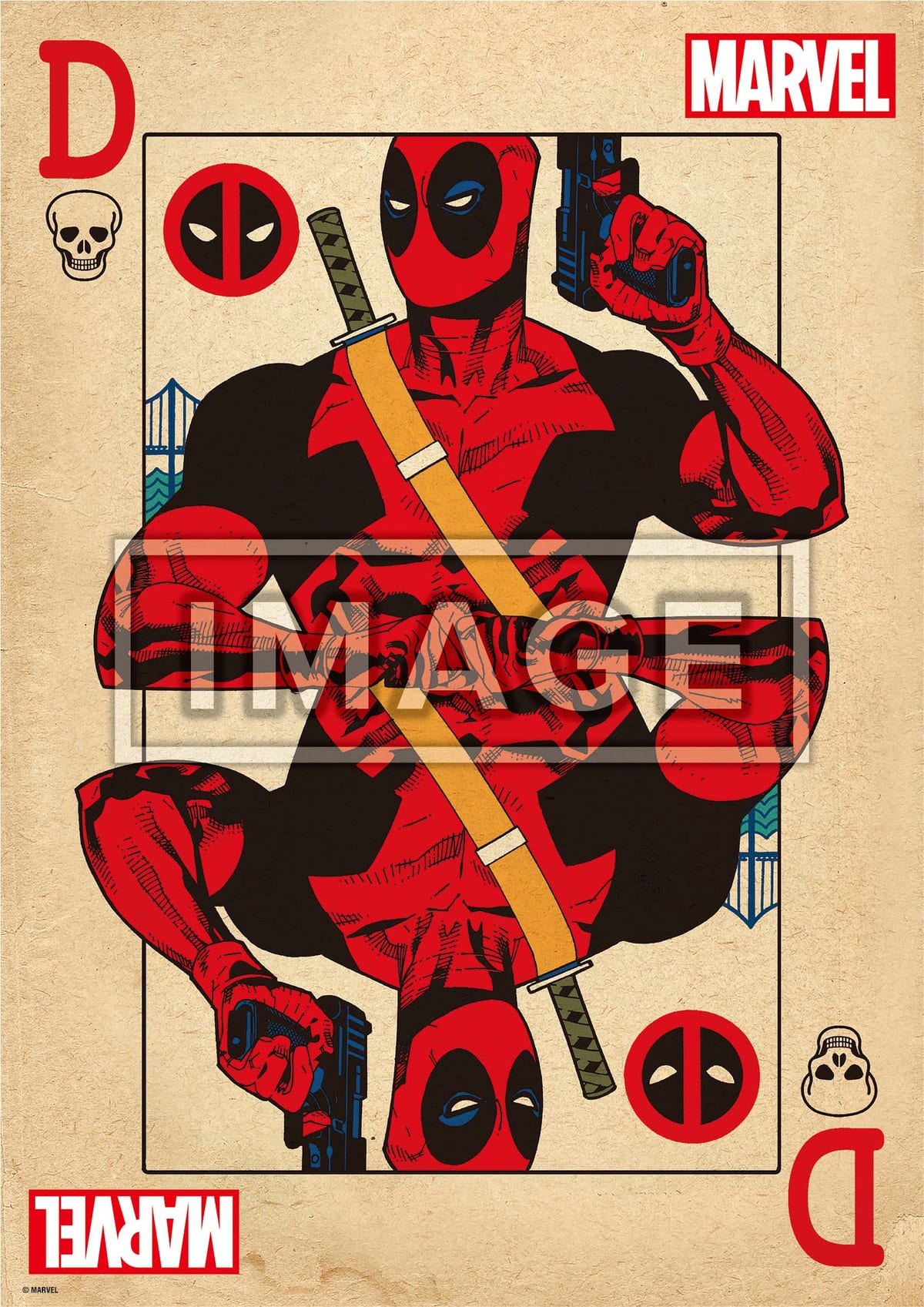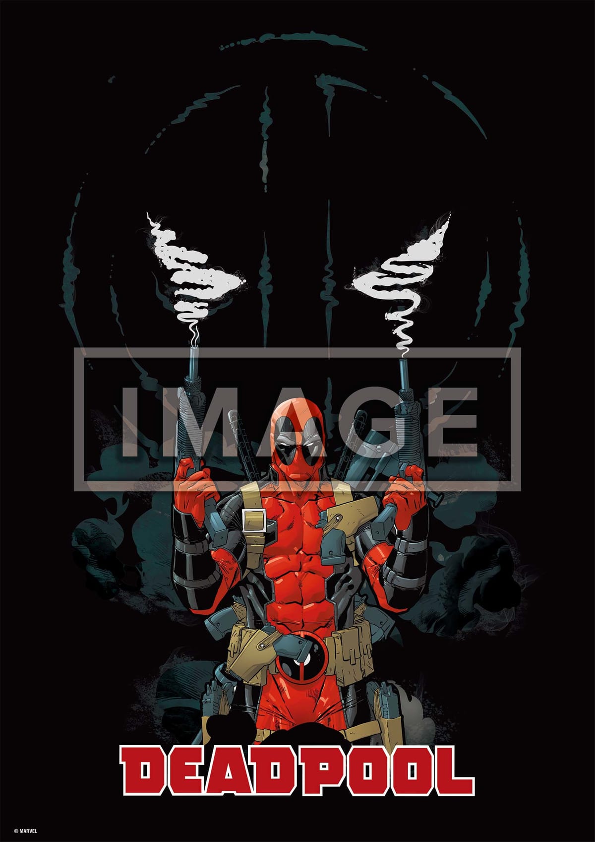「デッドプール」のアイコンをバックに、両手にハンドガンを持った鬼気迫るアート