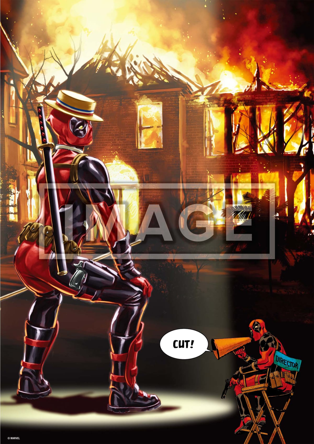映画監督と俳優になりきる姿が、燃え盛る屋敷と一緒に描かれたアート