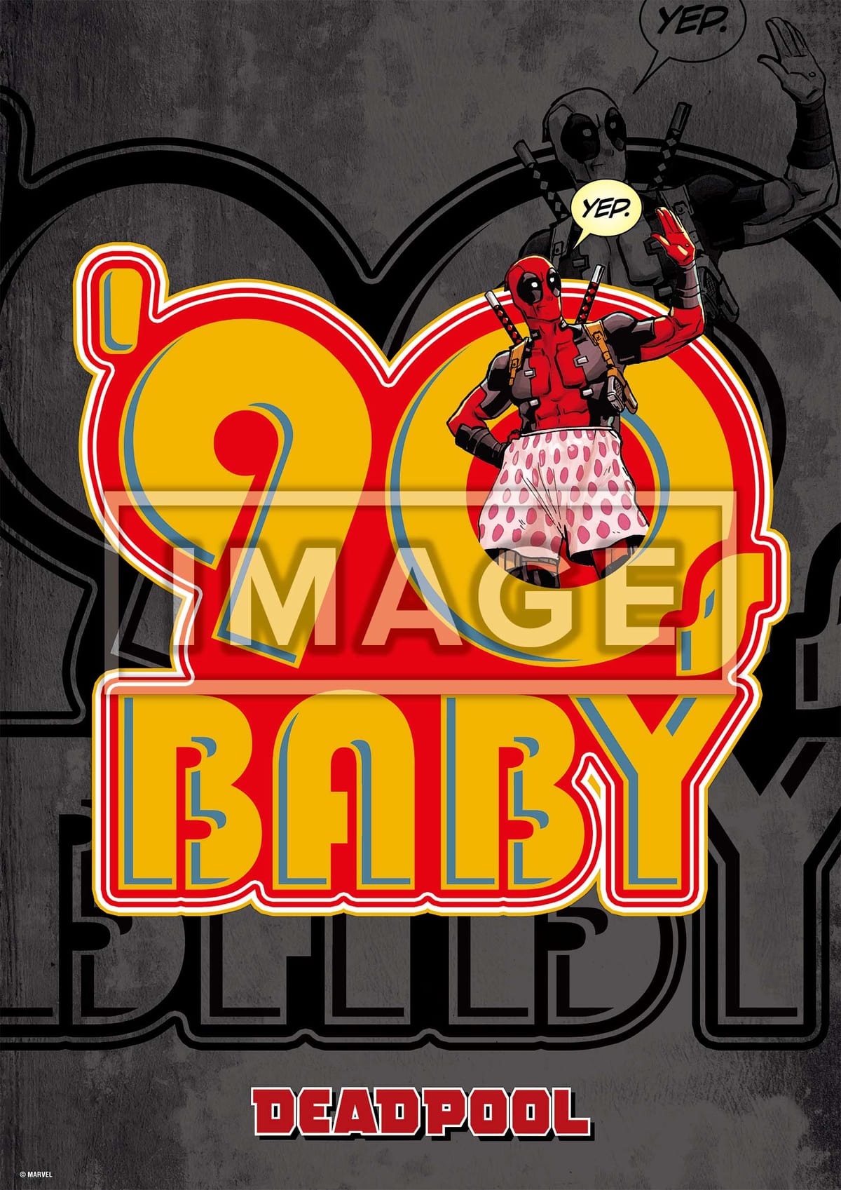 中央に配された「90's BABY」の文字とトランクス姿の「デッドプール」が描かれたポスターや