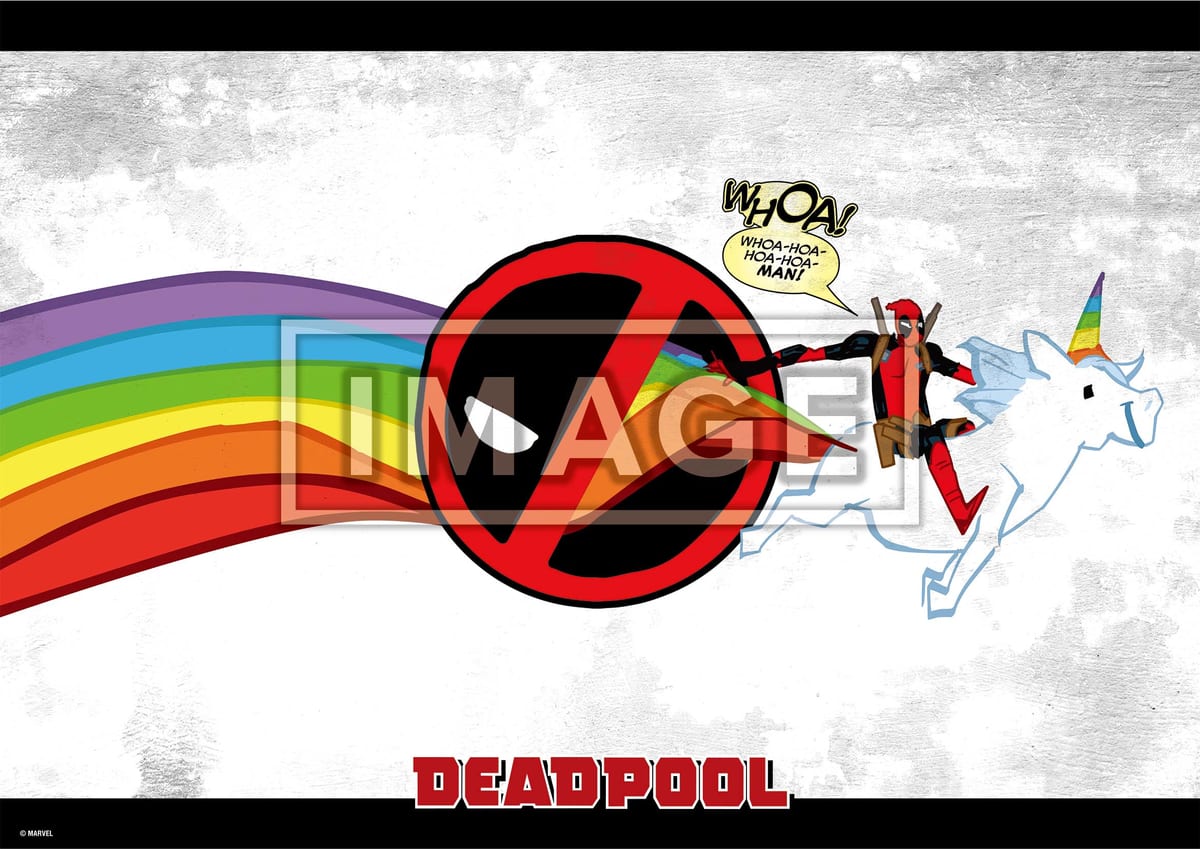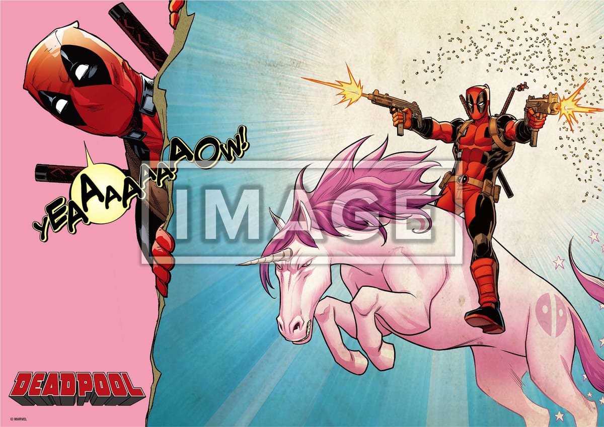 虹色に染められたユニコーンの尻尾をつかみ「デッドプール」のアイコンをくぐる愛らしいポスターなど全20類がラインナップ。