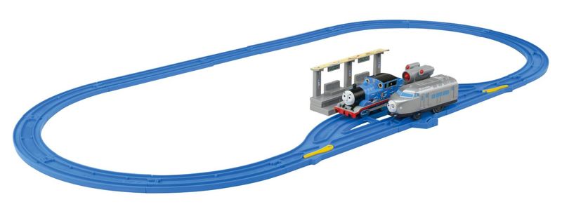 商品内容:トーマス(動力車)(1)、ケンジ(プルバック)(1)、ぶっ飛びブースター(1)、後部バッファー(1)、駅(1)、直線レール(2)、1/2直線レール(2)、1/2ストップレール(1)、曲線レール(8)、単線・複線ポイントレール(A)(1)、単線・複線ポイントレール(B)(1)、シール(1)