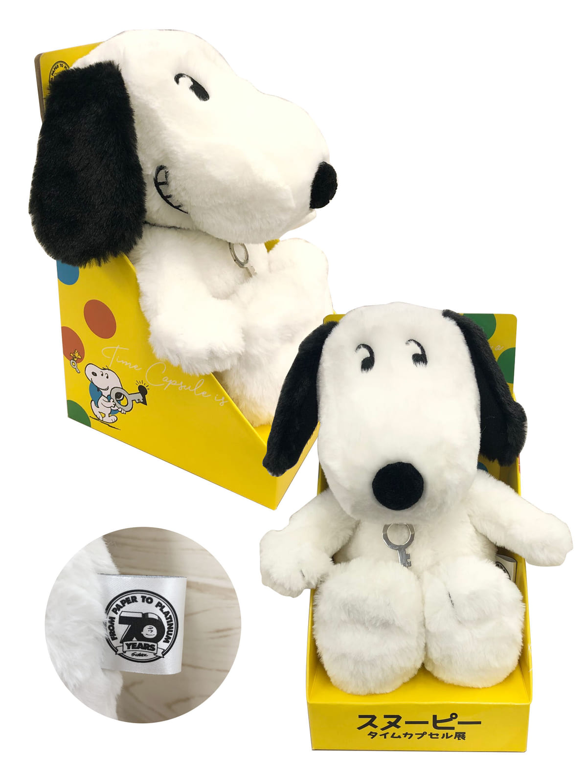 70周年を記念するタグが付いた「スヌーピー」のぬいぐるみ。
