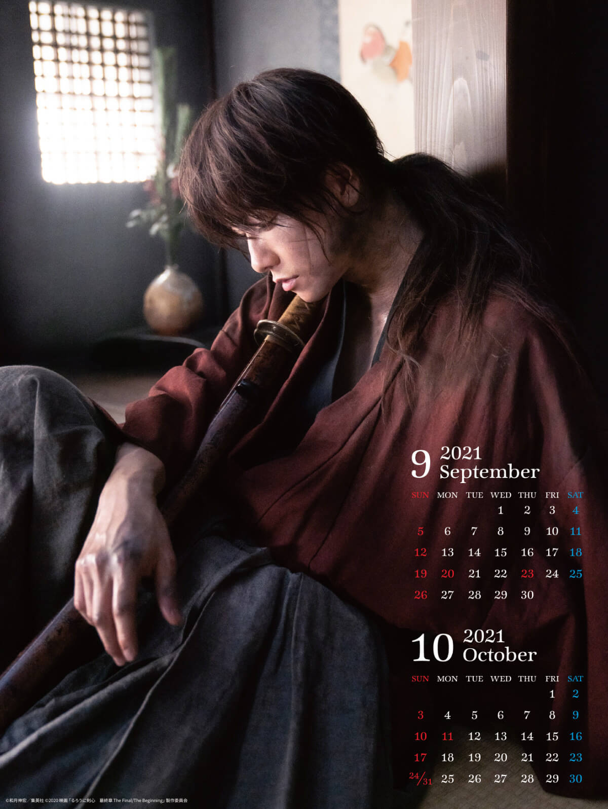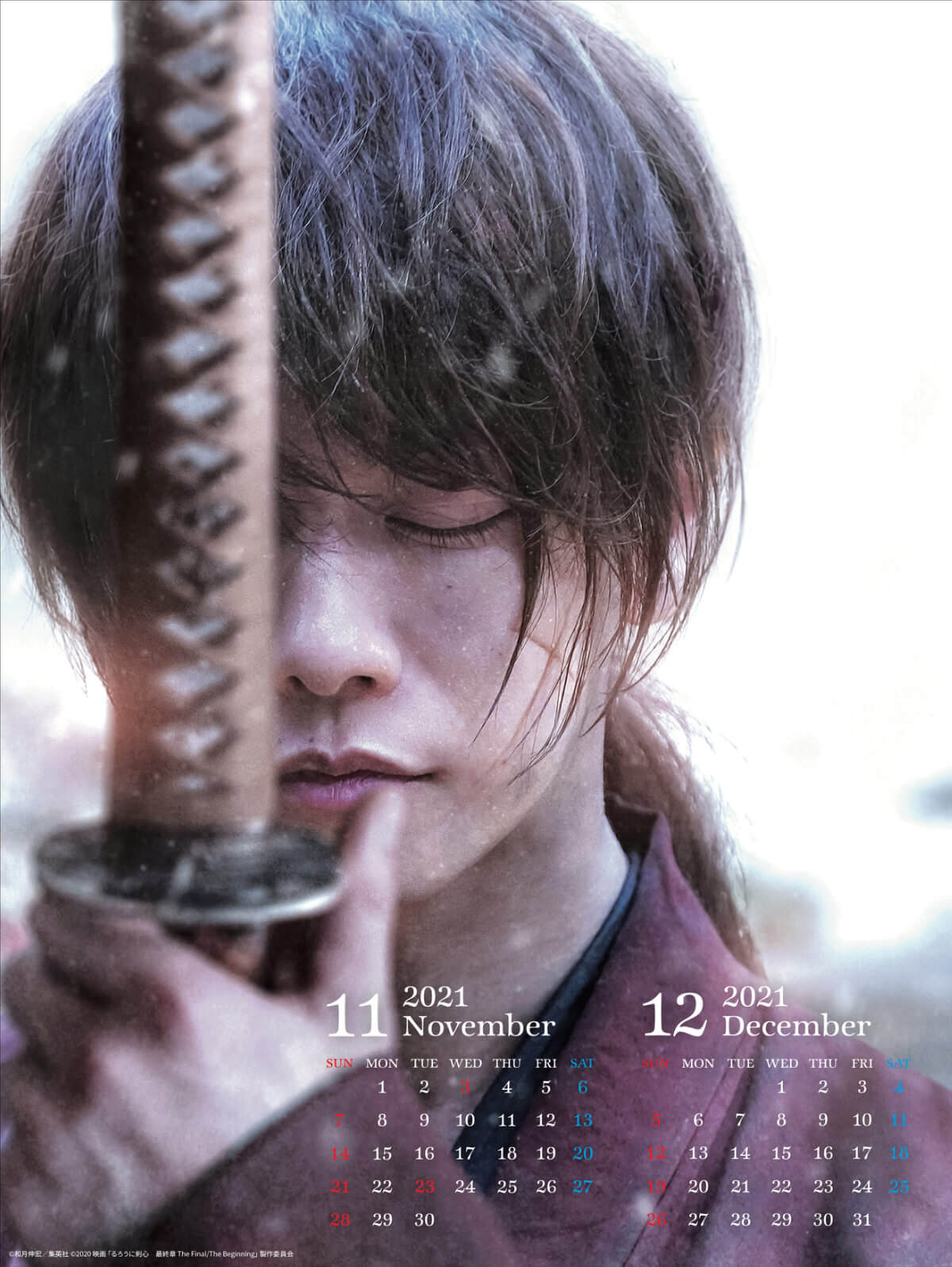 逆刃刀に手をかけ、瞳を閉じる主人公「緋村剣心」が表紙を飾る、2021年5月スタートの「壁掛けカレンダー」