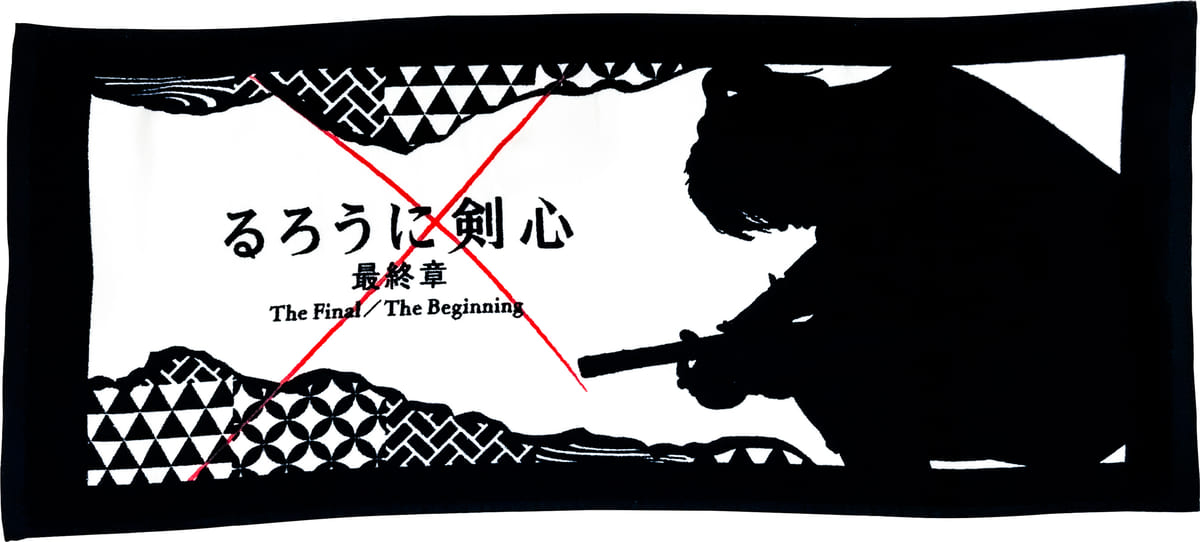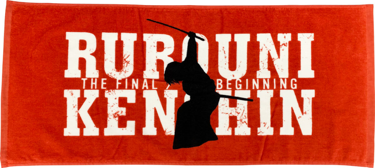 かすれ調のタイトルロゴをバックに抜刀する「緋村剣心」のシルエットがレイアウトされた「フェイスタオル」
