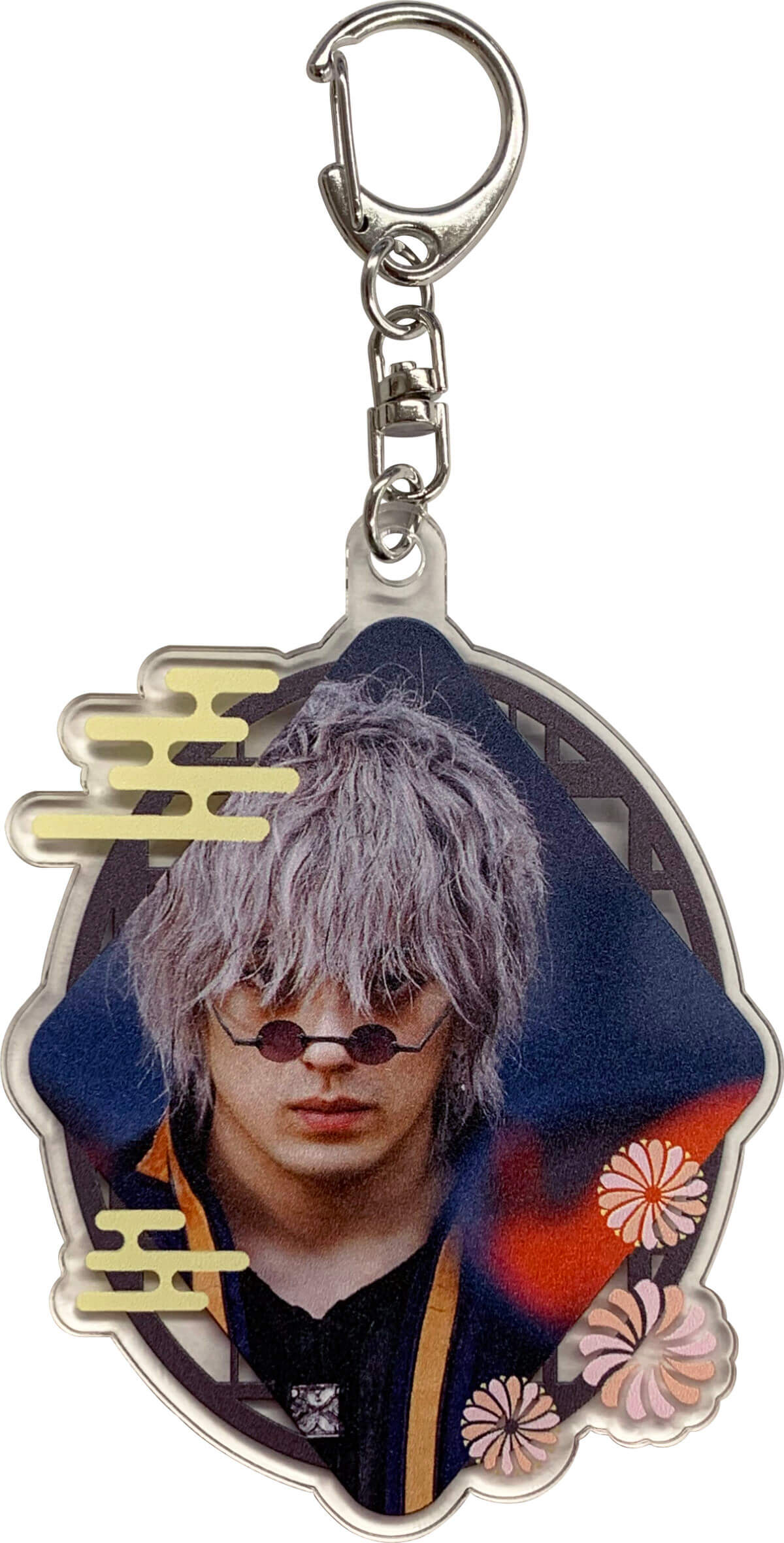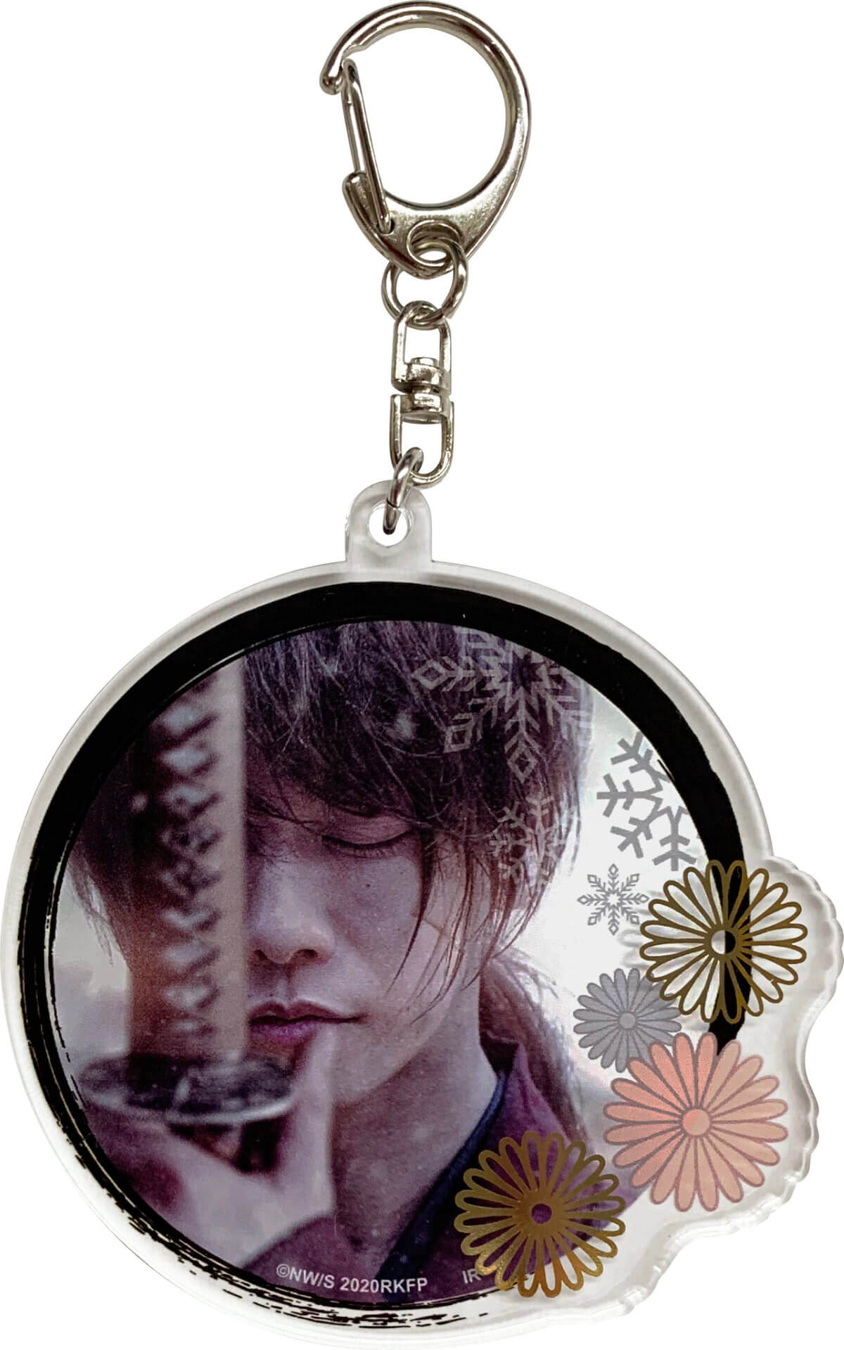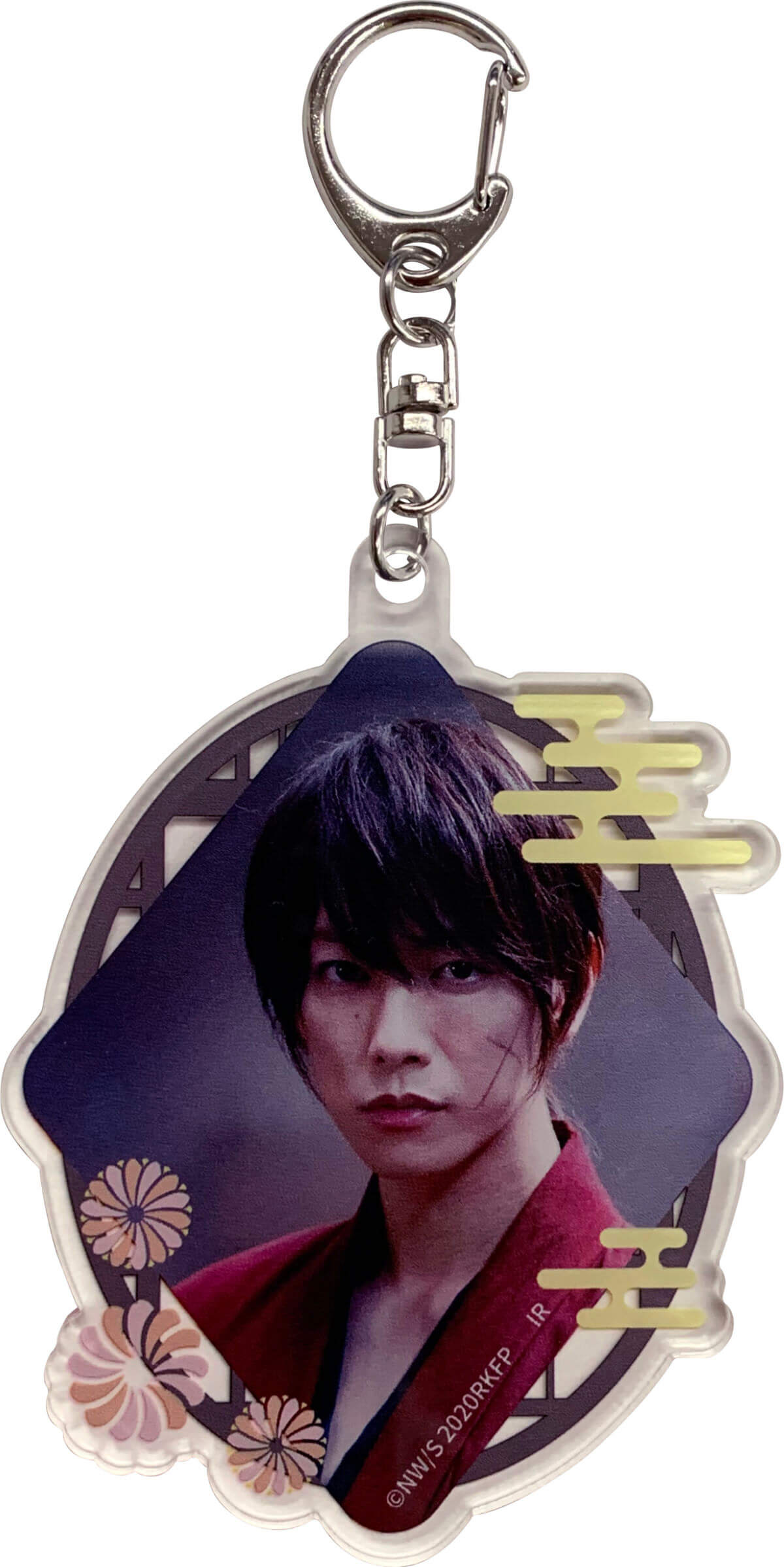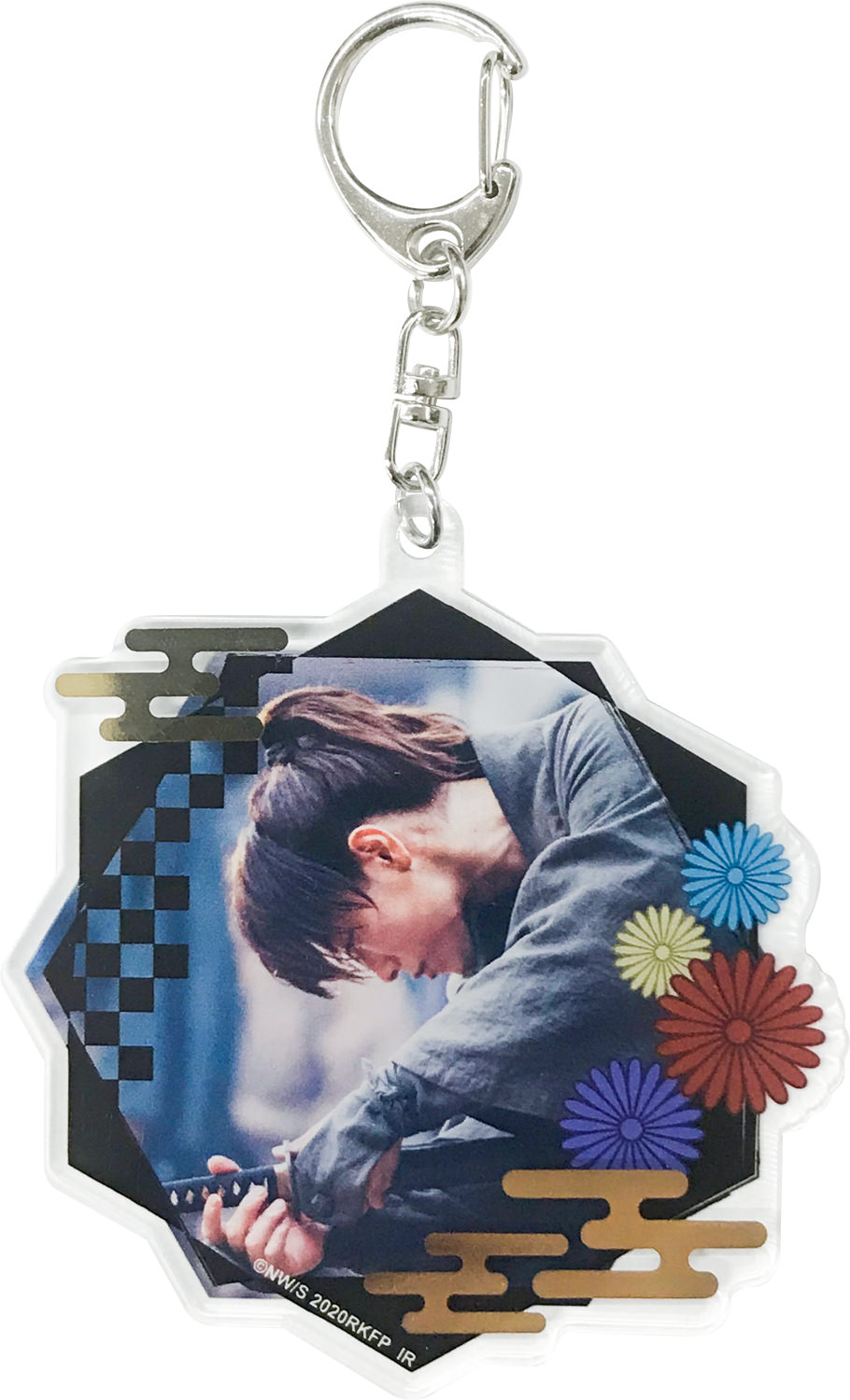 二重に重なる六角形に「緋村抜刀斎」のアートが施された「箔押しアクリルキーホルダー」
