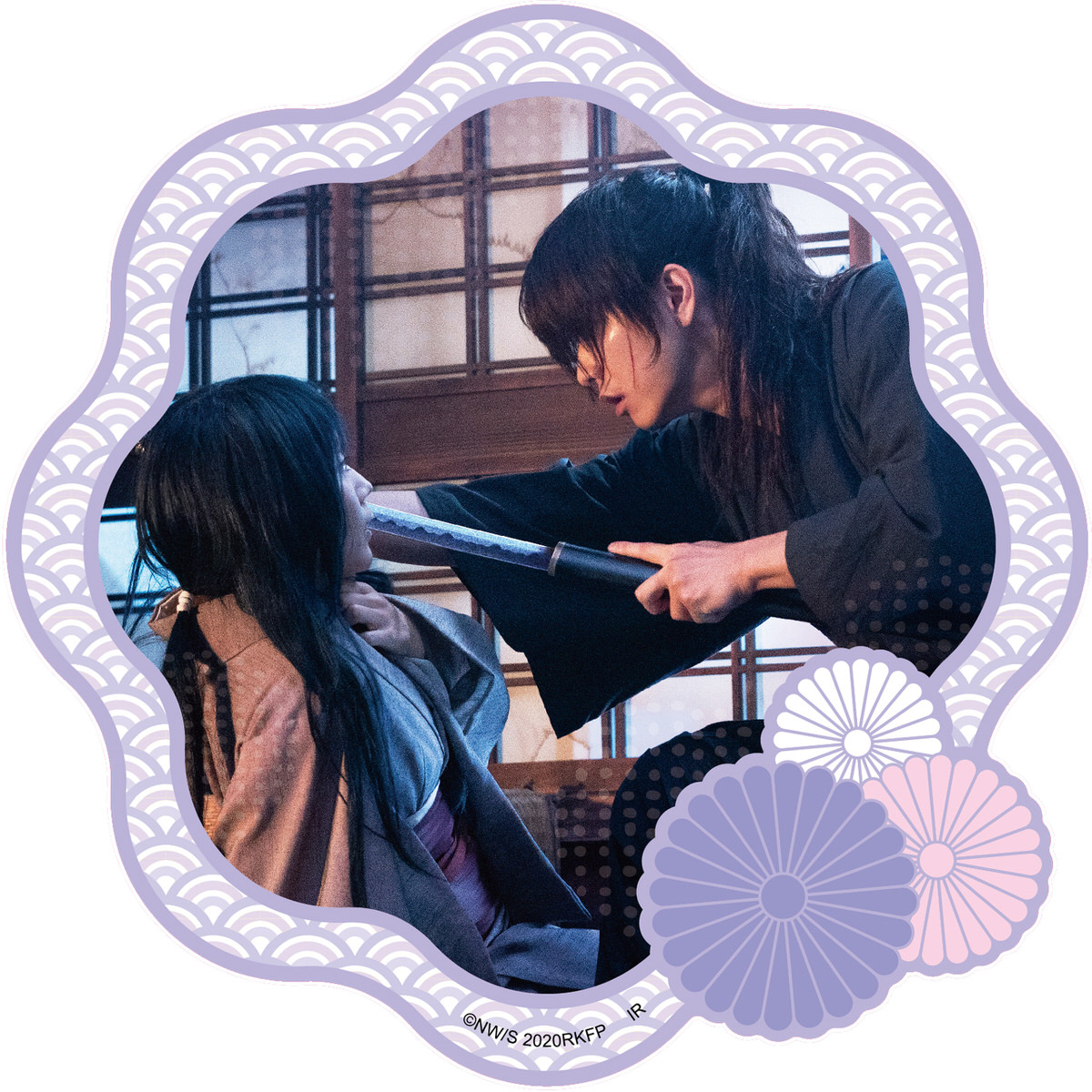 藤色を基調にした「ダイカットステッカー」には「緋村抜刀斎」と「雪代巴」の思い出深いワンシーンをプリント。