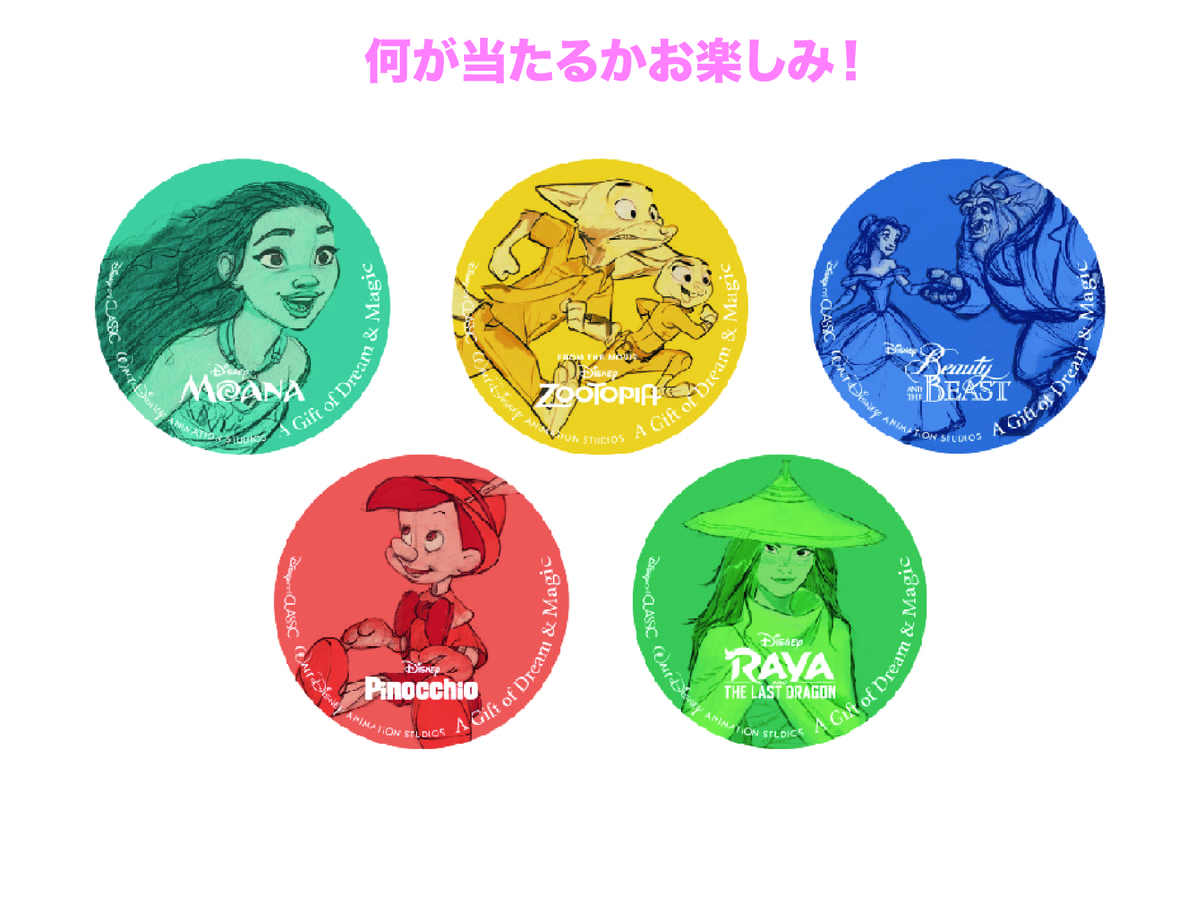 『モアナと伝説の海』『ズートピア』『美女と野獣』『ピノキオ』『ラーヤと龍の王国』の全5種類。