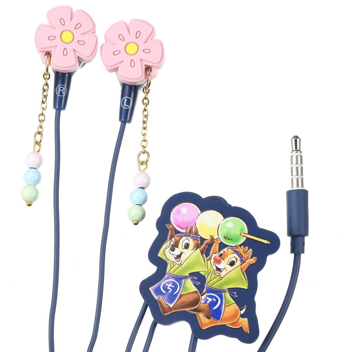 イヤホン部分に桜の形をしたらくがんと揺れるお団子が配された、マイク付き「電子機器用ステレオイヤホン」