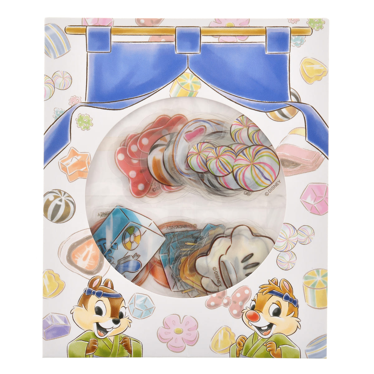 「チップ」と「デール」のボディをモチーフにした手鞠のような飴玉や、ミッキーアイコンの焼印がはいった団子、「プルート」をイメージした練り切りなどが繊細に描かれた、和を感じられるシールです。