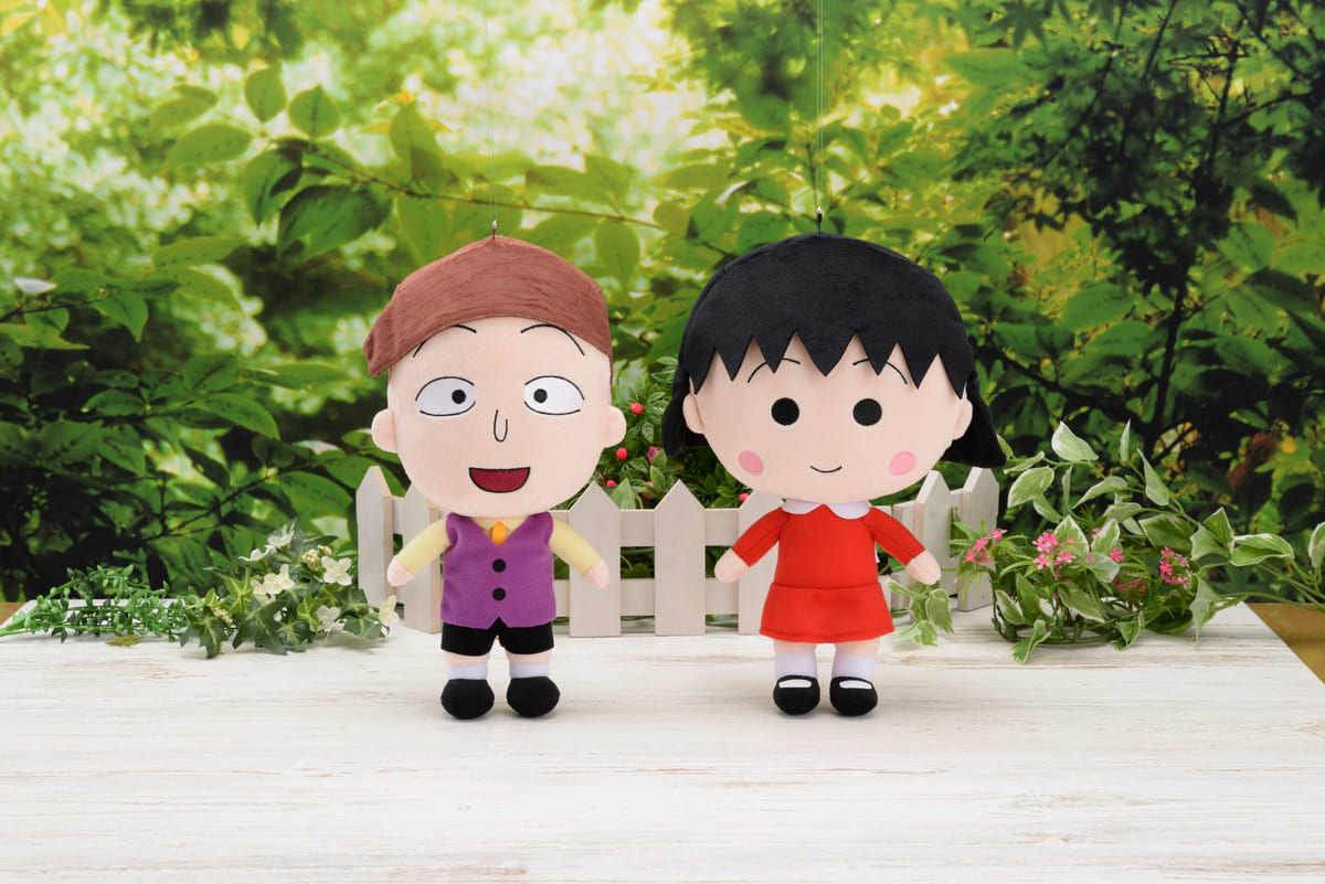 おめかしした「まる子」と「花輪クン」デザインのスペシャルぬいぐるみ。