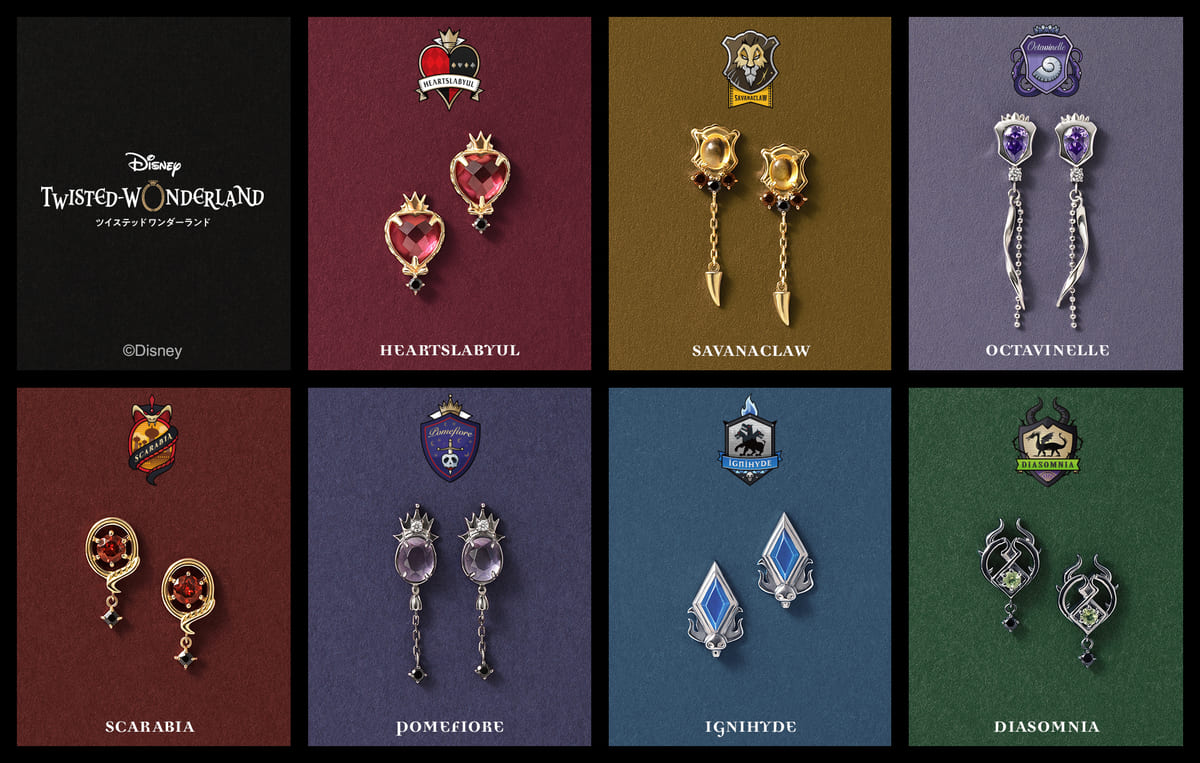 名門魔法士養成学校「ナイトレイブンカレッジ」の7寮をイメージしたピアスとイヤリングがラインナップされます☆