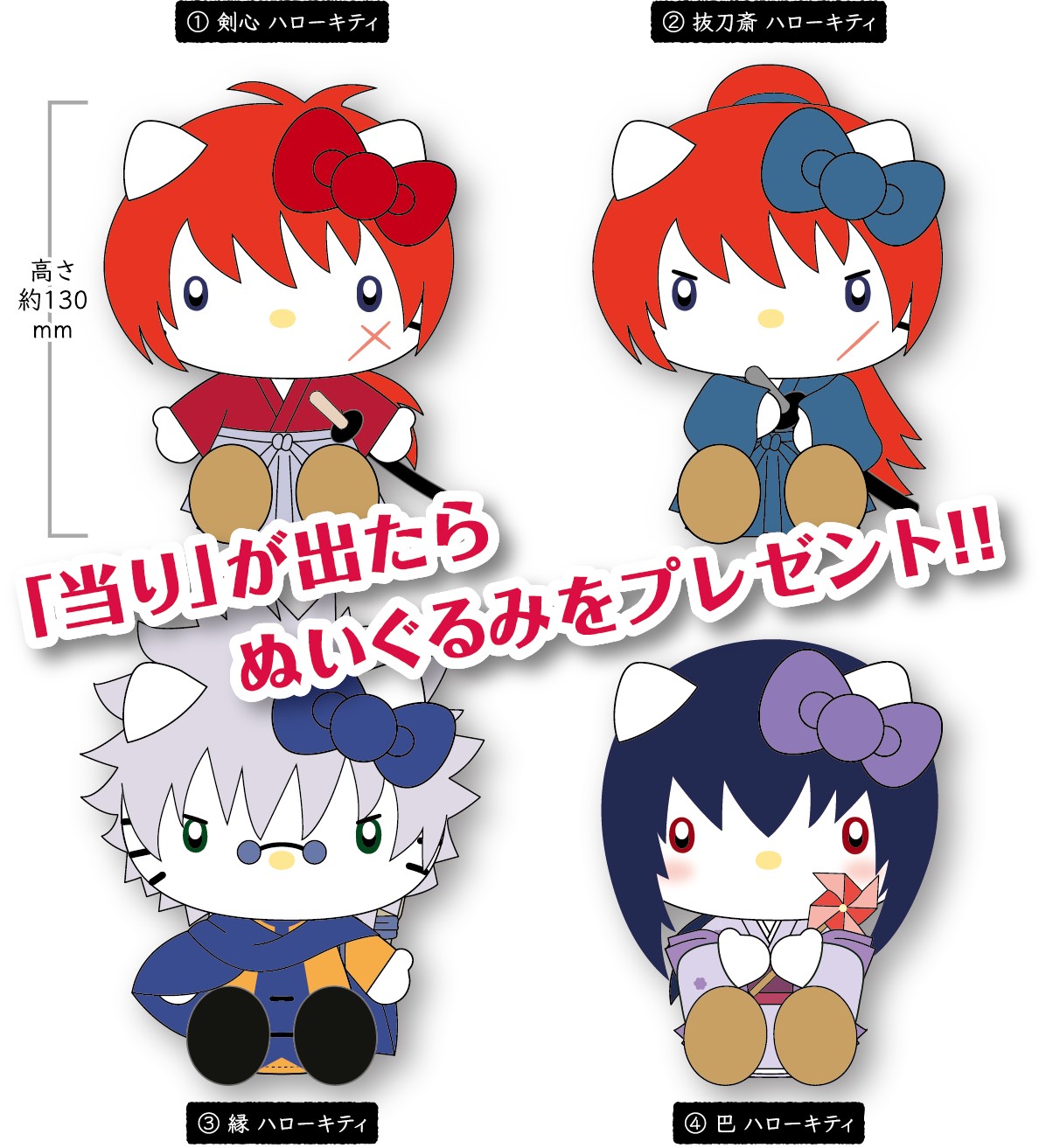 当りが出たら「剣心」たちと「ハローキティ」のコラボぬいぐるみ(高さ130mm)をプレゼント。