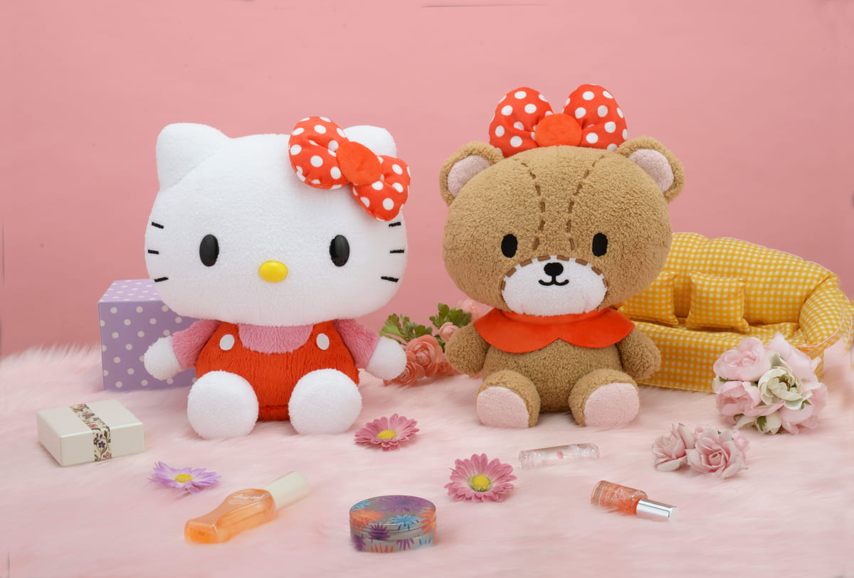 「ハローキティ」と「タイニーチャム」がおそろいのリボンで登場、ペアで揃えてより可愛いぬいぐるみです。