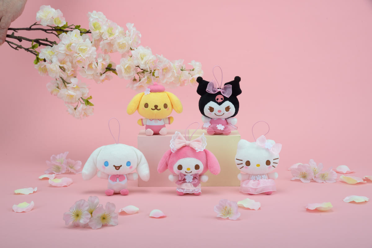 桜をモチーフにした、ピンク色の衣装をまとった「ハローキティ」「マイメロディ」「クロミ」「ポムポムプリン」「シナモロール」のマスコットです。