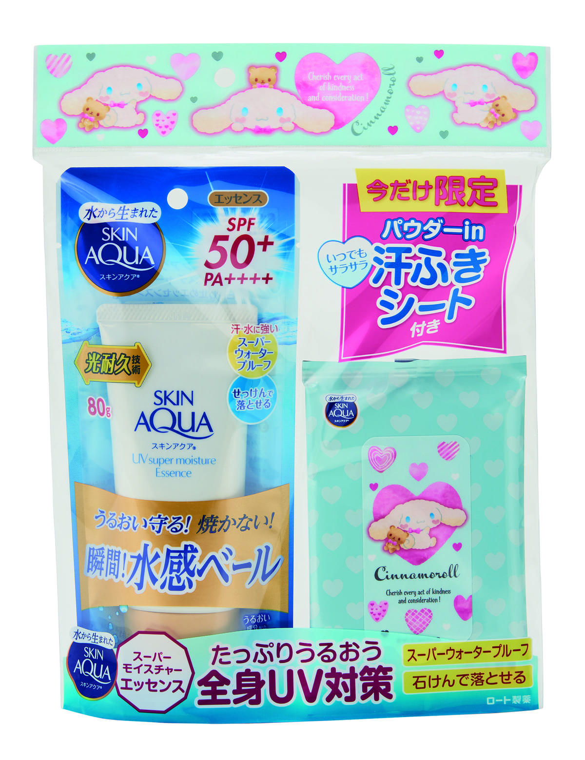 商品パッケージと、付属の汗拭きシートは、「シナモロール」の描き下ろしデザイン!
