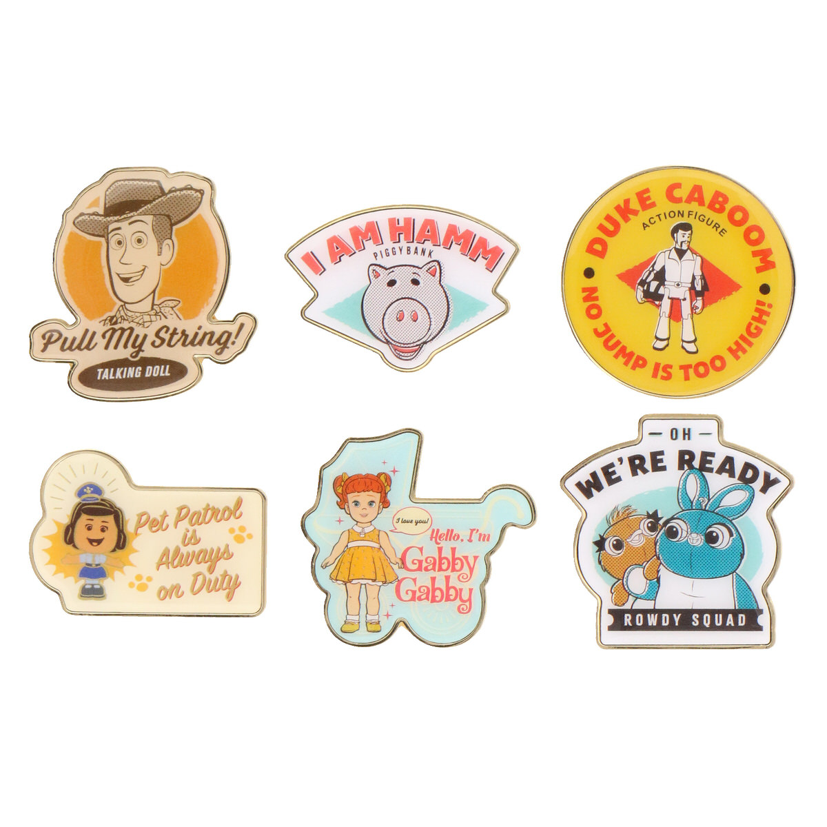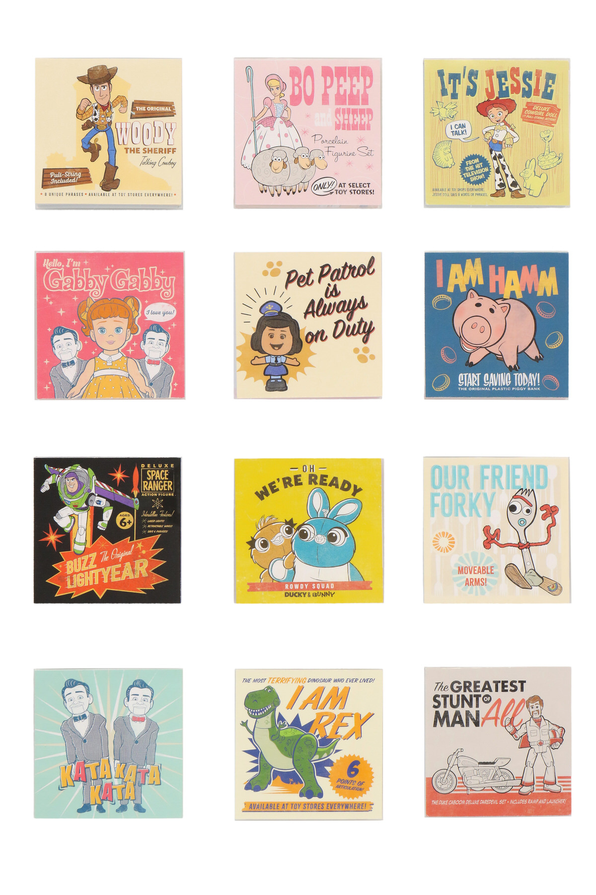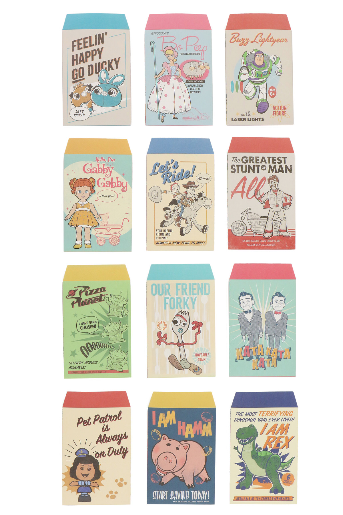 ウッディ、ボー・ピープ、フォーキー、リトル・グリーン・メン(エイリアン)、デューク・カブーンの5種類です。