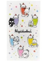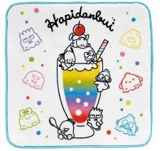 クリームソーダに集まる楽しげなキャラクターたちがデザインされたタオルハンカチ。