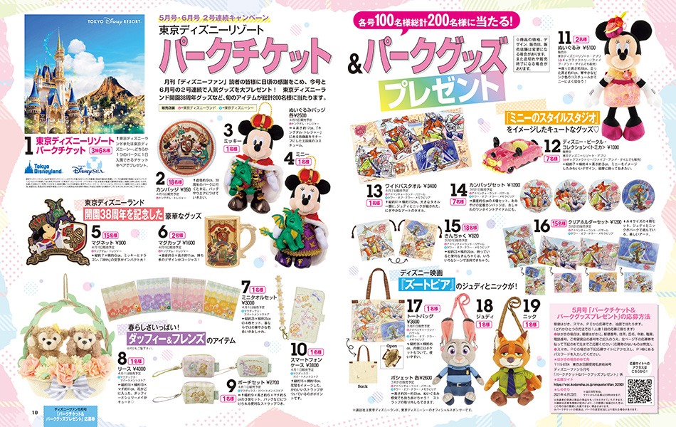 「ディズニーファン」5月号では、東京ディズニーリゾートのパークチケットや「ミッキーマウス」「ミニーマウス」「ダッフィー」『ズートピア』の「ニック・ワイルド」や「ジュディ・ホップス」など、キャラクターの人気グッズが合計100名様にあたる豪華プレゼント企画を開催!