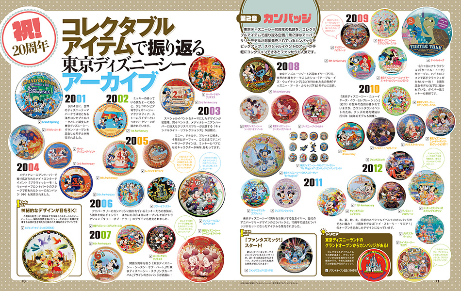 さらに、2021年に20周年を迎える東京ディズニーシーの特集では、開発時の貴重な画像を掲載した特別企画のほか、これまで発売されたカンバッジを一堂に集めた特集を掲載。