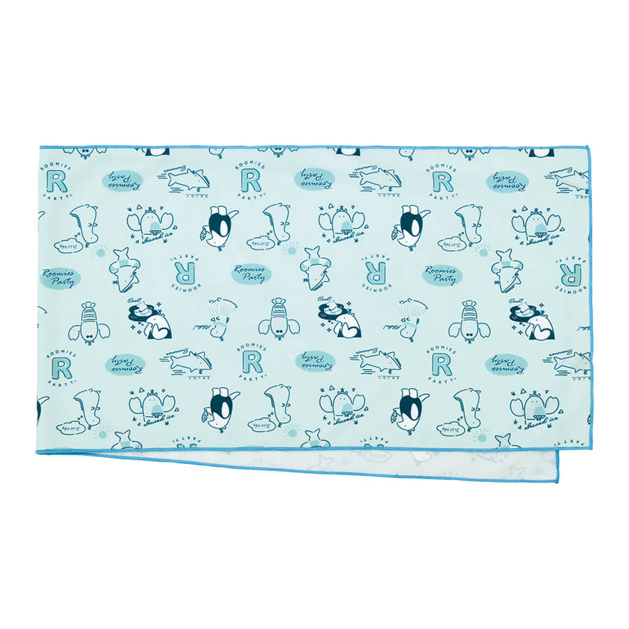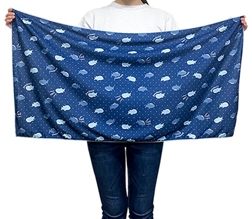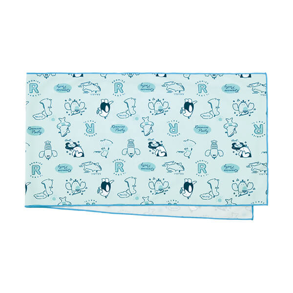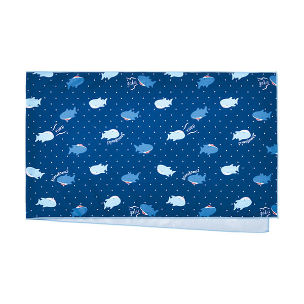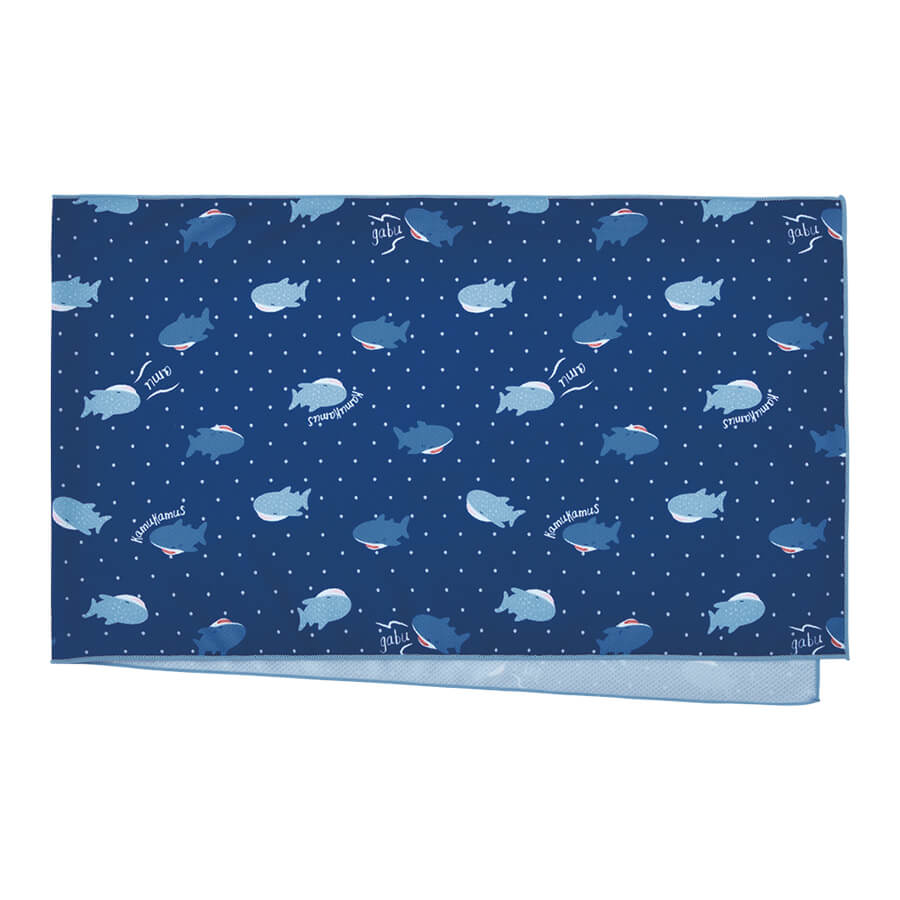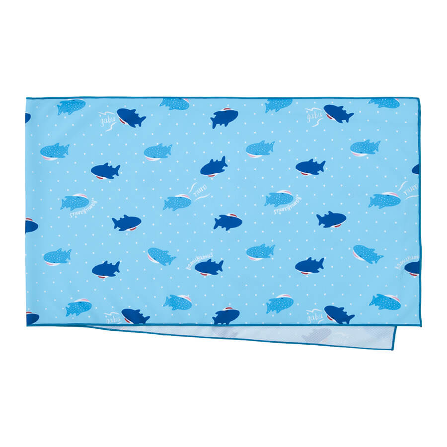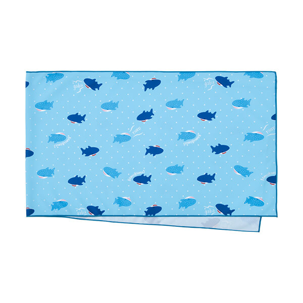 ブルーをベースに「かむかむズ」の「じんべえさん」と「ザップ」をあしらった「UVカットクールタオル タオルケット」