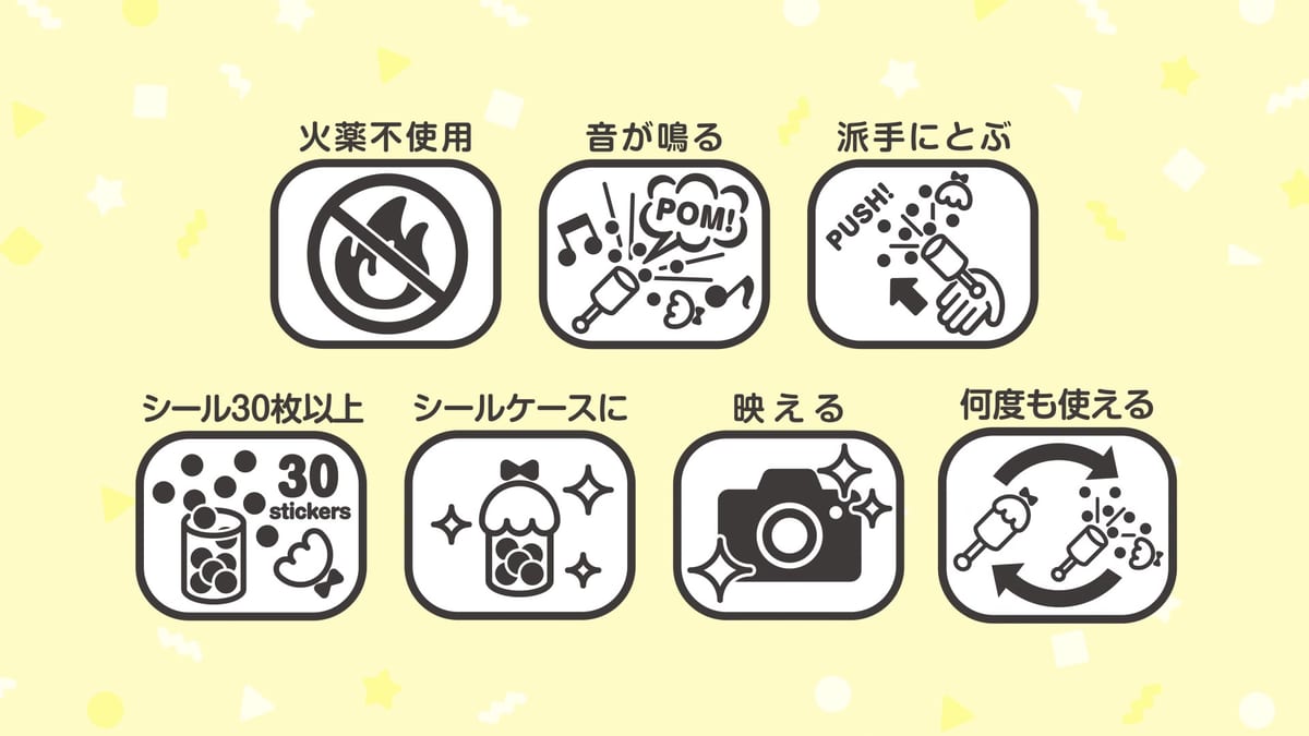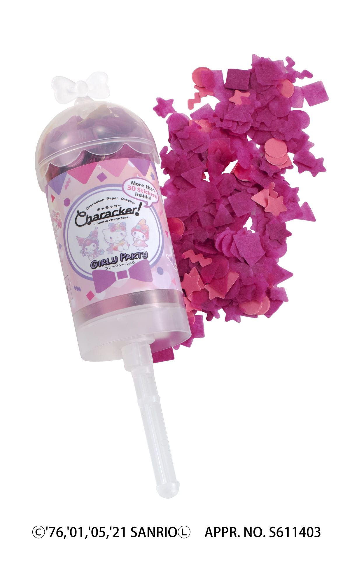 「キャラッカー サンリオキャラクターズ」は、火薬を使用していないため飛び出した紙吹雪とシールをケースの中に戻せば繰り返し楽しむことができ、様々なシーンで楽しめます。