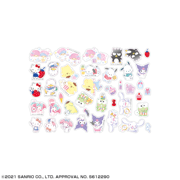 「ハローキティ」「マイメロディ」「クロミ」「シナモロール」「ポムポムプリン」「けろけろけろっぴ」「ポチャッコ」「バッドばつ丸」「あひるのペックル」「リトルツインスターズ」のかわいいシールが入っています。