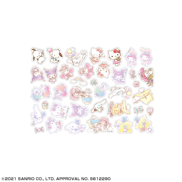 「ハローキティ」「マイメロディ」「クロミ」「シナモロール」「ポムポムプリン」「ポチャッコ」「リトルツインスターズ」のシールが入っています。