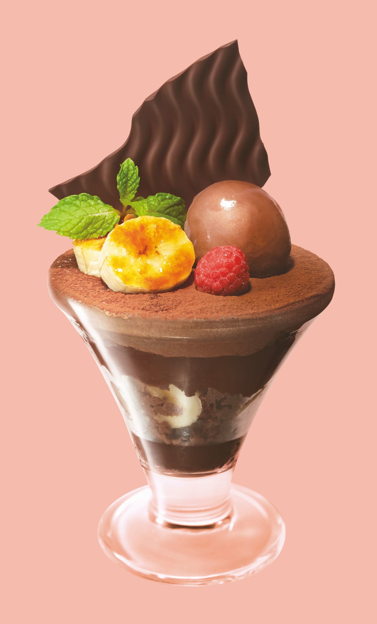 グラスに美しく重ねたのは、ゴディバ監修のなめらかなミルクチョコクリームをはじめ、ソルベやアイスクリーム、カカオゼリーなどの多様なチョコレートたち。