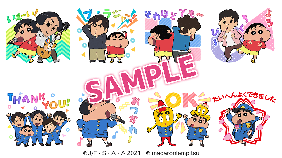 LINEスタンプには、マカロニえんぴつのメンバーと「しんのすけ」のツーショットや、「まかぴーくん」と「しんのすけ」のツーショットも収録。