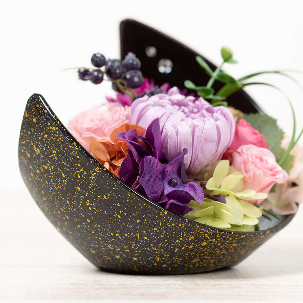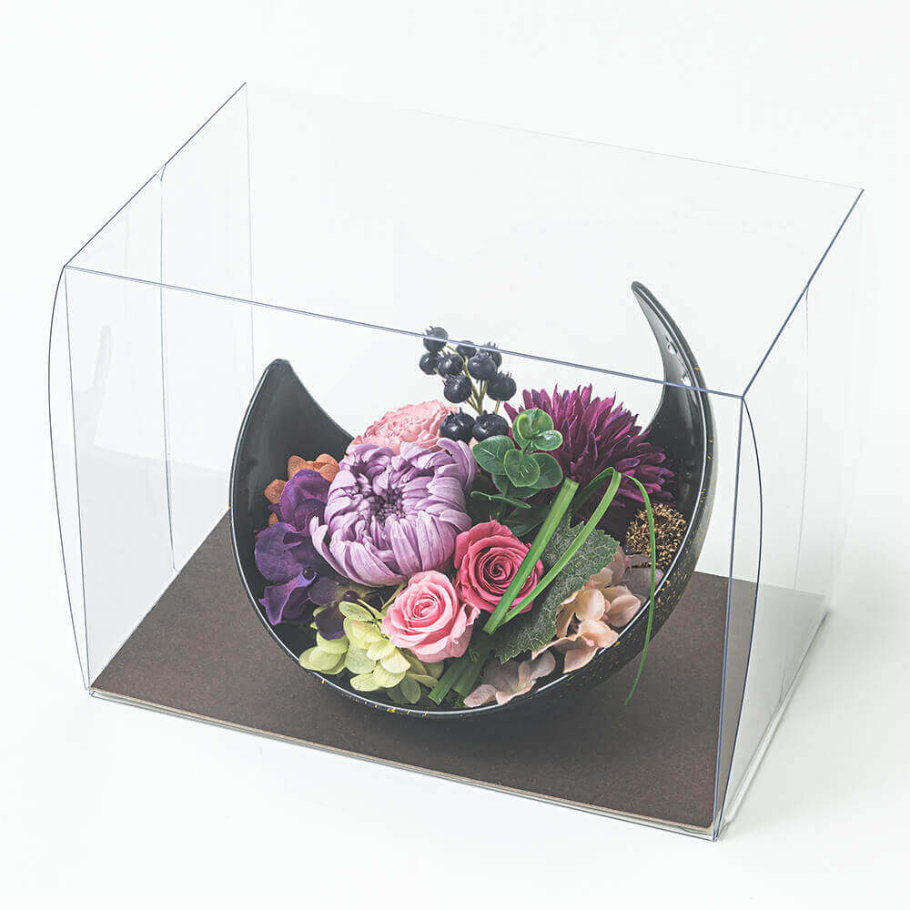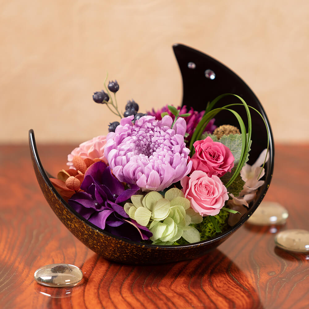 「月華美人~大好きなお母さんへ~」は、夜空に浮かぶ三日月のような美しいフォルムと、月の雫のようにあしらったイミテーションストーンの煌めきが遠くからでもパッと目を惹く和モダンアレンジメント。