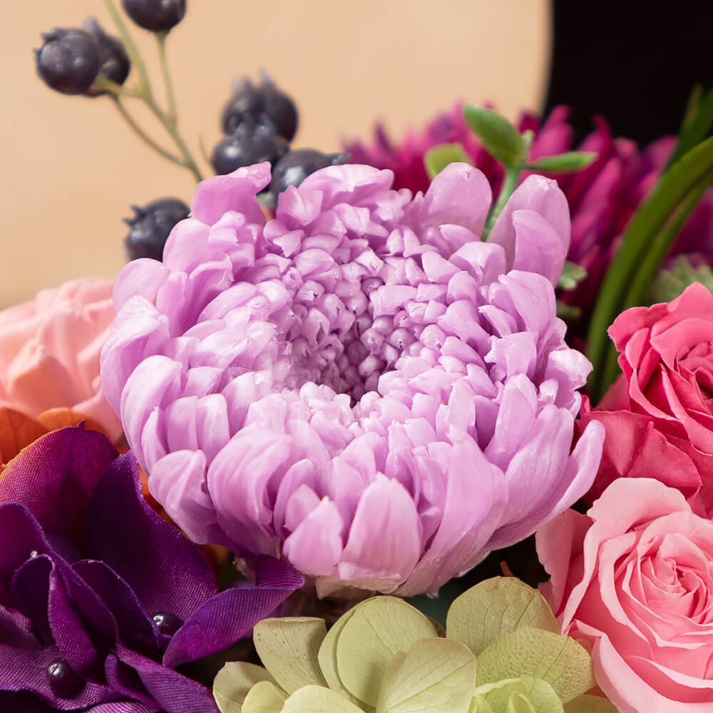 中心に咲いている紫色のお花はプリザーブドフラワーの中でも希少な輪菊。