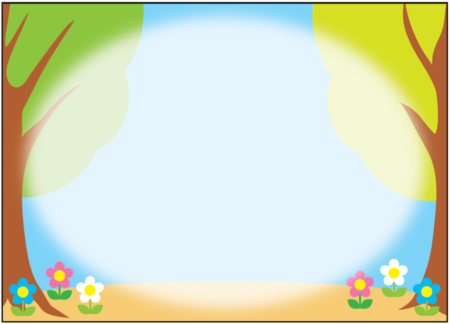 色とりどりのお花や、葉が生い茂った木に、うきうきしてくる春のイラストです。