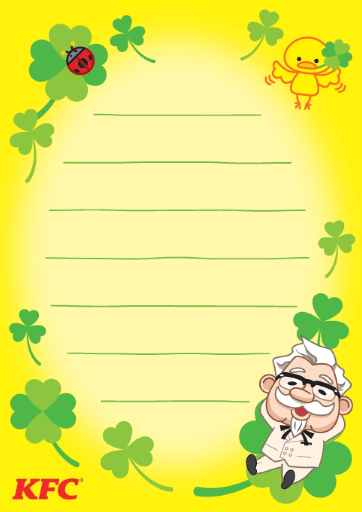 便箋と封筒には、ピクニックやクローバー摘みを楽しんでいるカーネルと仲間たちが描かれています。