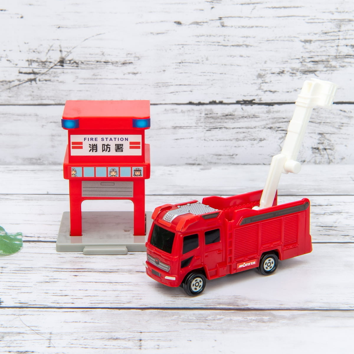 第1弾「卜ミカのまち」は働く車と建物パーツのセットで、「消防署&モリタ13mブーム付多目的消防ポンプ自動車MVF」や、「マクドナルド レストラン&マクドナルドデリバリーバイク」など、建物パーツとの組み合わせで遊びの幅がさらに広がります。