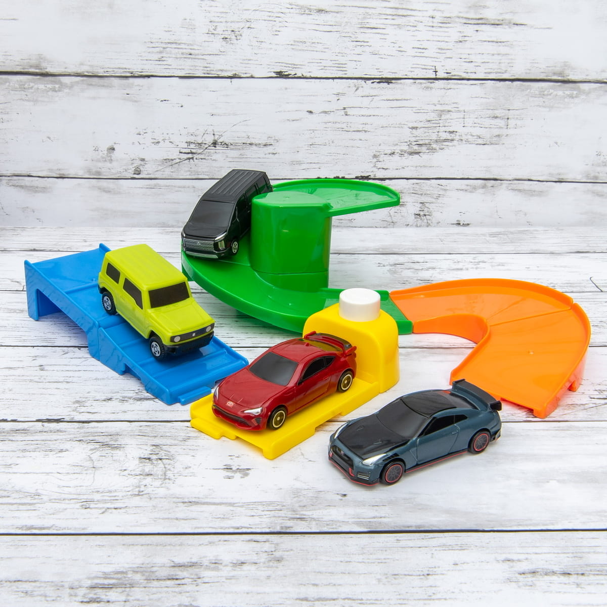 第2弾「トミカのどうろ」は人気のスポーツカー・ファミリーカーと道路パーツのセットで、「ランチャー付き道路&トヨタ 86」など、道路パーツを使うことで、より多彩な走り方が楽しめます。