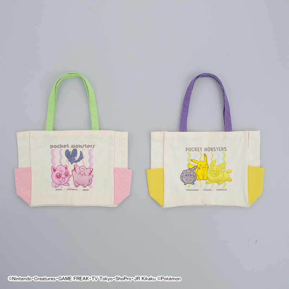 「うたう」が得意な「プリン」「ピッピ」「チラーミィ」と、「ほっぺすりすり」がたまらない「ピカチュウ」「ワンパチ」「トゲデマル」デザインのトートバッグ。