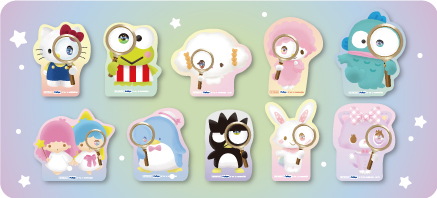 「ハローキティ」「けろけろけろっぴ」「こぎみゅん」「ピアノちゃん」「ハンギョドン」「リトルツインスターズ」「タキシードサム」「バッドばつ丸」「ウィッシュミーメル」「ミュークルドリーミー」のダイカットステッカー。