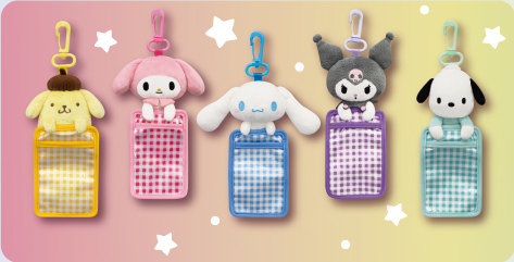 「ポムポムプリン」「マイメロディ」「シナモロール」「クロミ」「ポチャッコ」のぬいぐるみが付いた、フォトホルダーです。