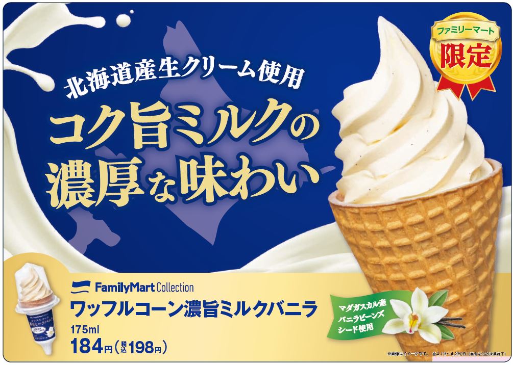 ファミリーマートオリジナルアイスとして長年愛されている定番「ワッフルコーン 北海道ミルクバニラ」を、北海道産生クリームのコクが、バニラの香りにこだわって7年ぶりにリニューアル。