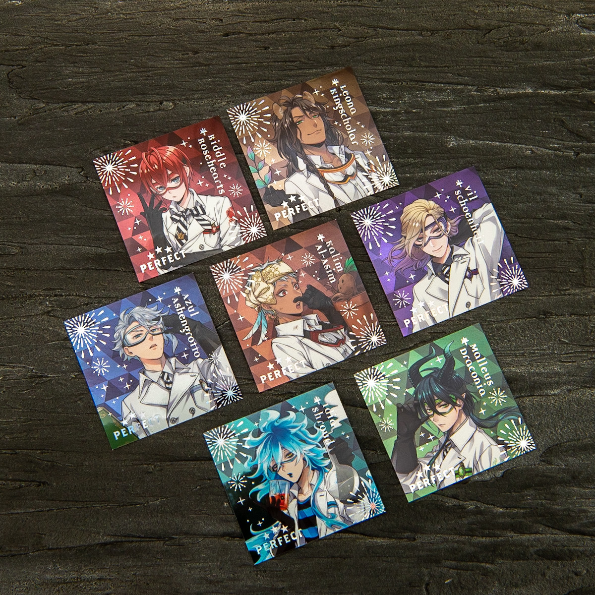 「リドル・ローズハート」「レオナ・キングスカラー」「アズール・アーシェングロット」「カリム・アルアジーム」「ヴィル・シェーンハイト」「イデア・シュラウド」「マレウス・ドラコニア」の7寮長がレアシールとしてラインナップ。