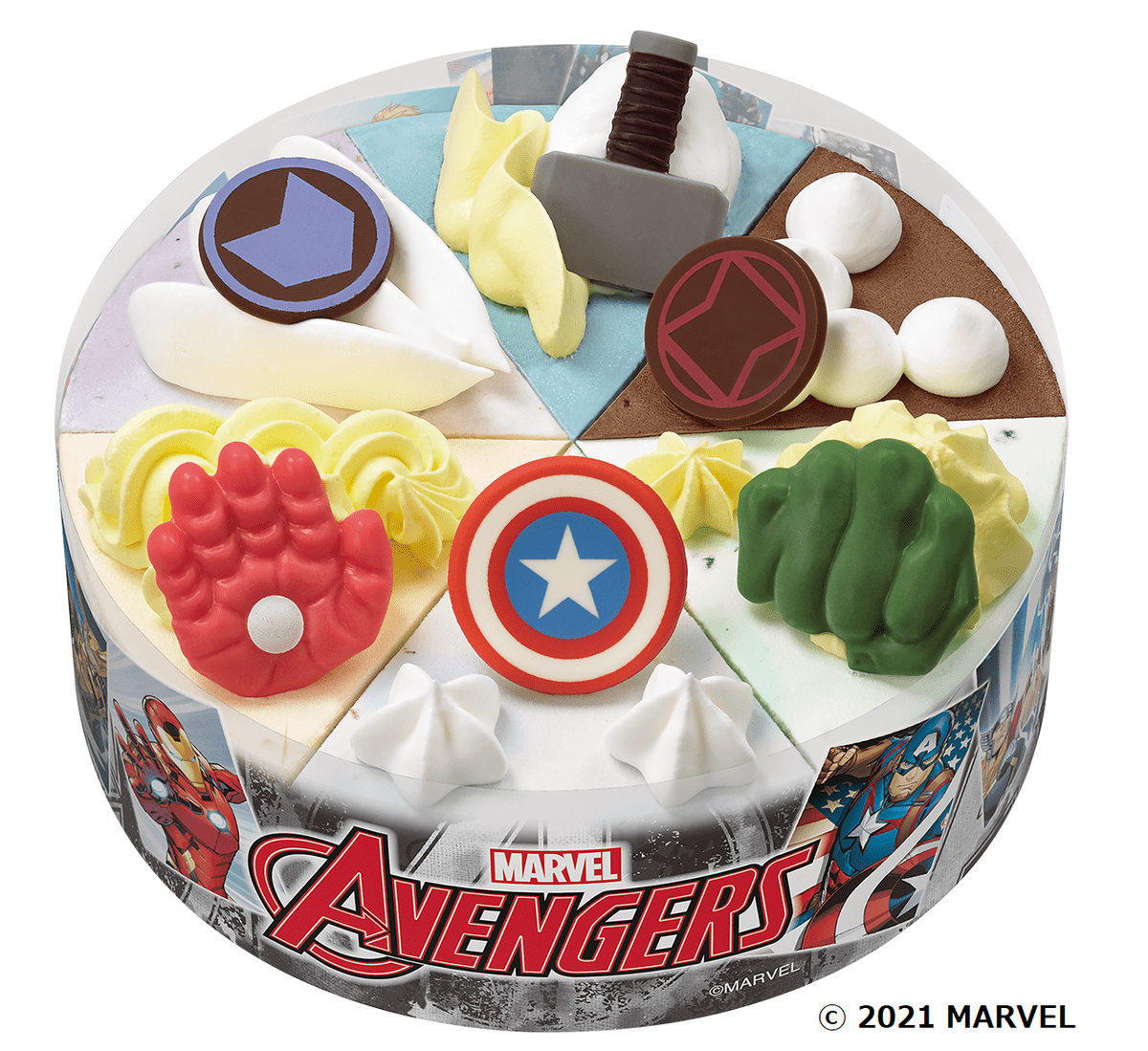 アベンジャーズの初期メンバーをテーマにした、6ピースのアイスクリームケーキがラインナップ。