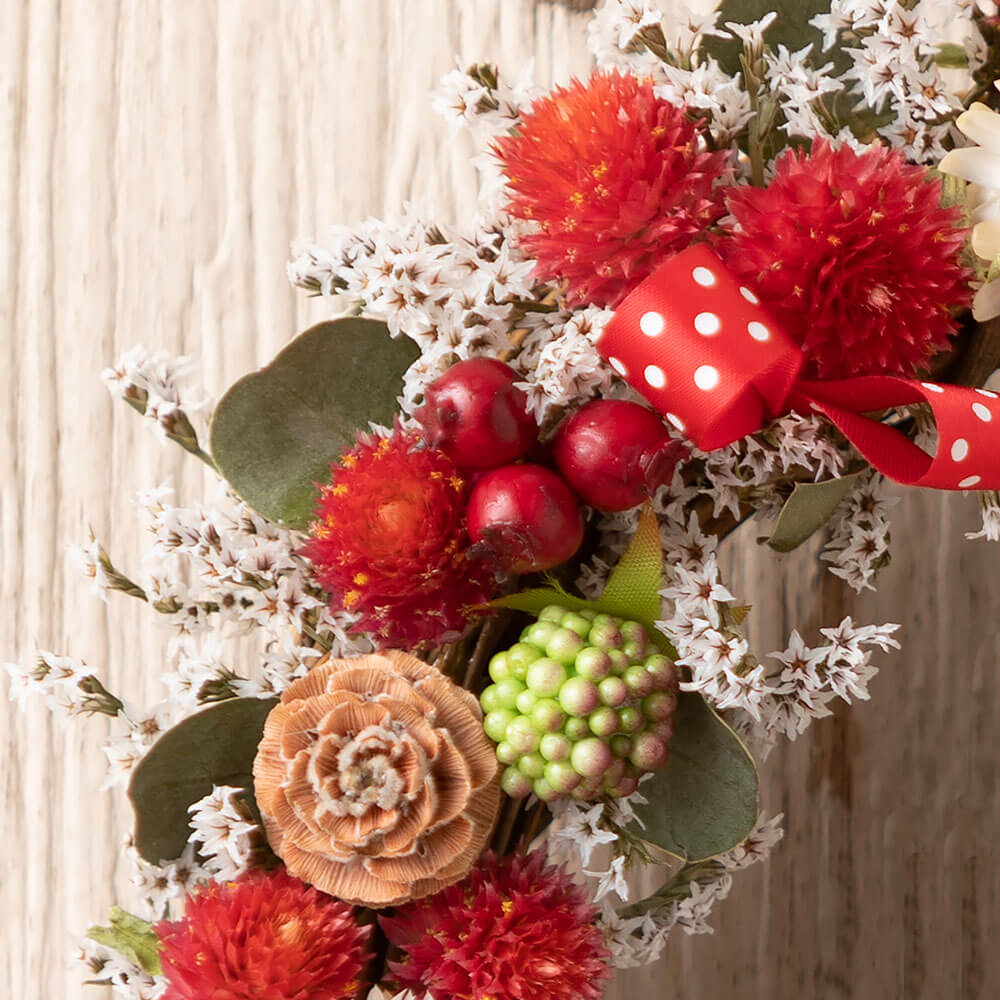 千日紅やヘリクリサムなどの赤や白の花々に、水玉のリボンがポップでキュートなリース・ディズニー/ドライフラワー「ミニーマウス ハピネスリース」