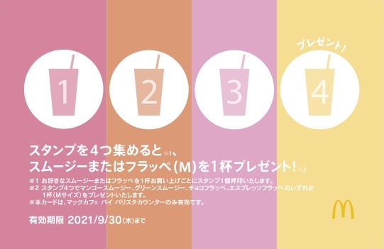 スタンプを4つ集めると、レギュラーメニューのスムージー(マンゴースムージーもしくはグリーンスムージー)、またはフラッペ(チョコフラッペもしくはエスプレッソフラッペ)のMサイズが1杯無料でプレゼントされます☆