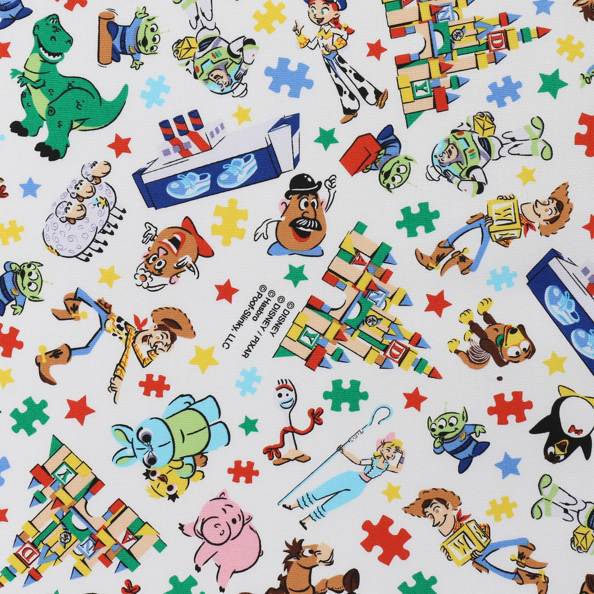 東京ディズニーランドや東京ディズニーシーで遊ぶ「ウッディ」「バズ・ライトイヤー」「ジェシー」たちの総柄です。
