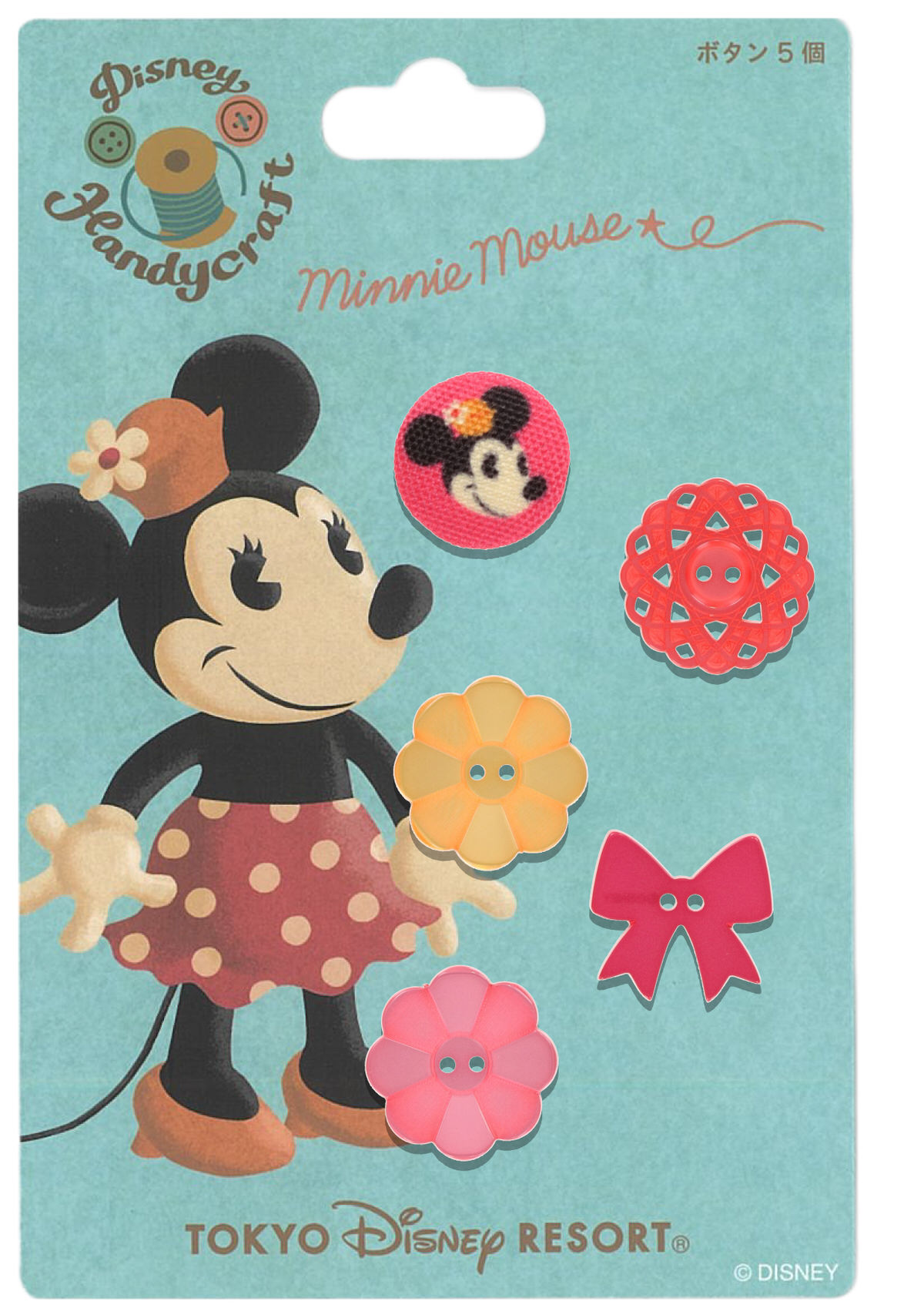 「ミニーマウス」デザインのボタン5個セット。