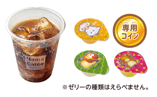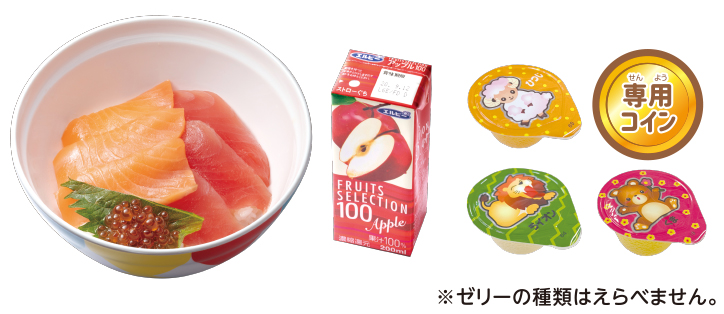 全てのセットでコーラやアップル100%ジュースなど6種類から選べるドリンクと、 ミニゼリー3個、専用ガチャマシーンのコイン が付いています。
